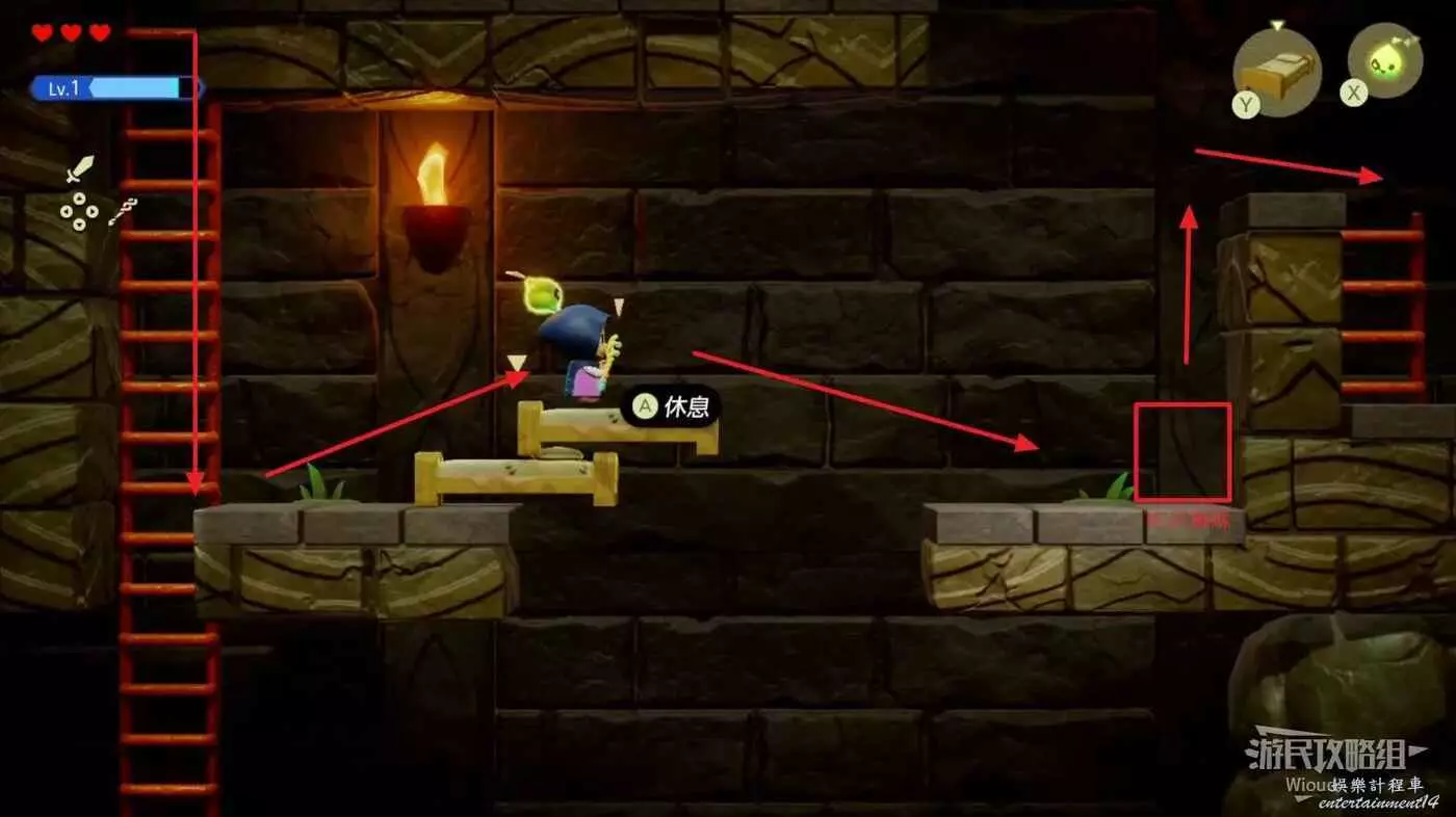 來到底層先使用蠟燭泥怪將下面的篝火點燃,右側被石頭擋住的地方直接放一張床能直接走過去,然後爬上石頭右側的樓梯。