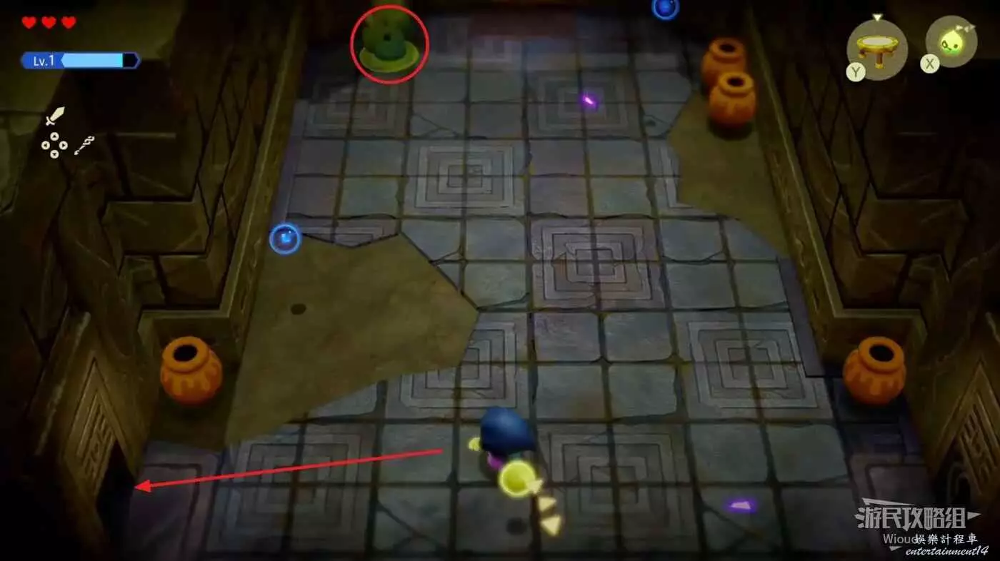 將這個房間裡右邊角落的綠色雕像移動到紅框的位置即可打開牢門,通過樓梯口往下走。