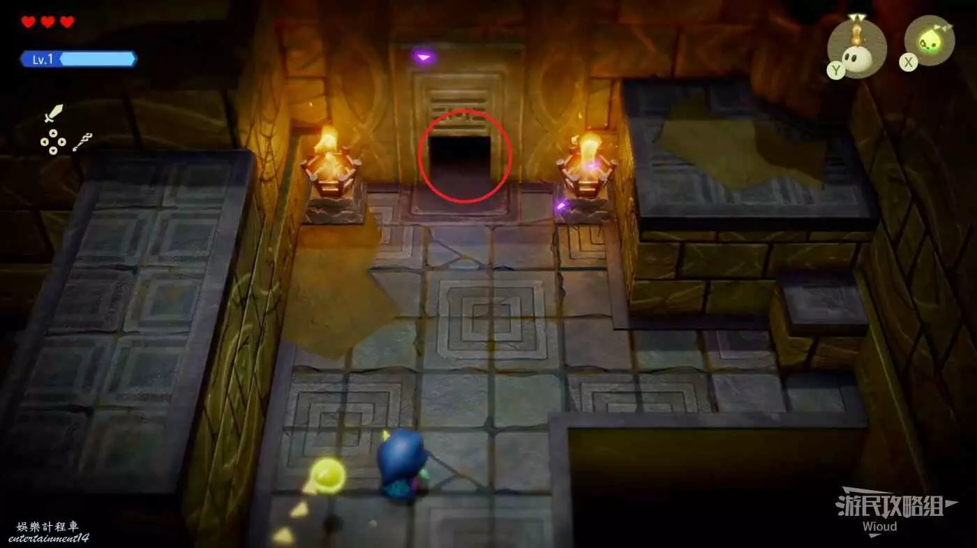 先不要走上面的路,移動到紫色屏障這裡,進入左邊大門。