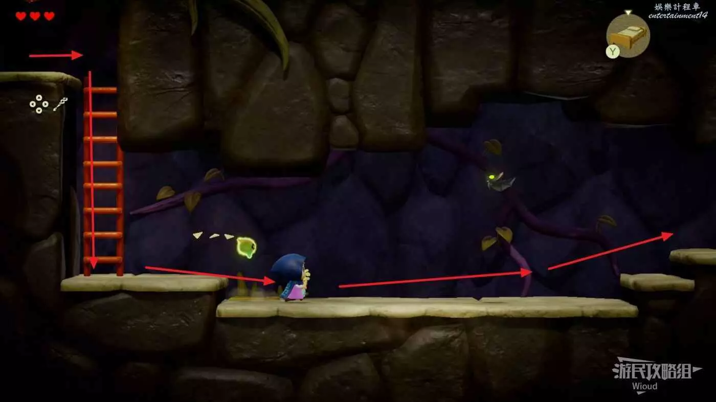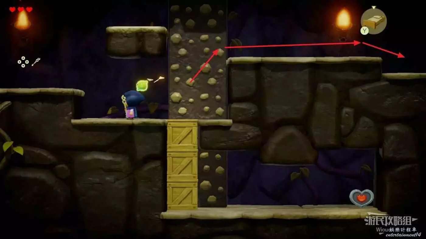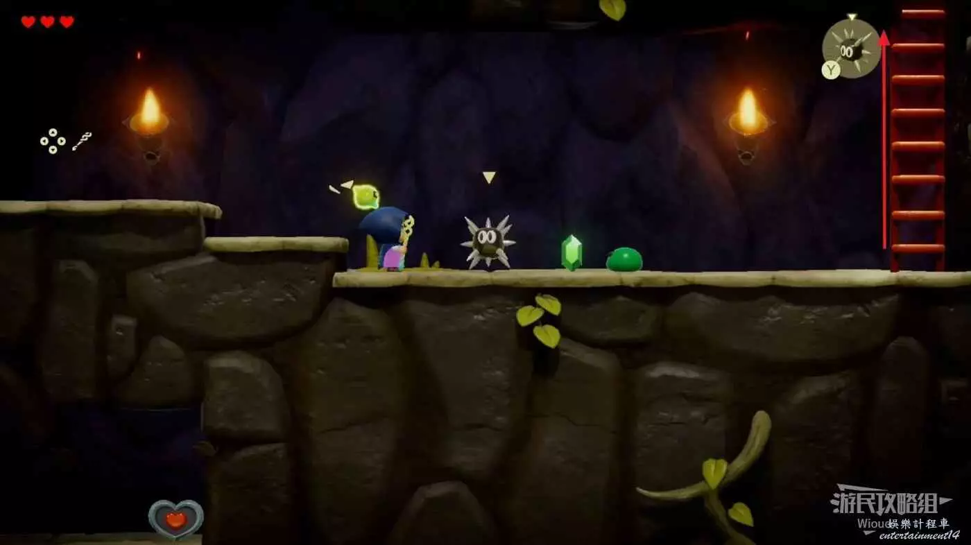 薩爾達傳說 智慧的再現 海岸洞窟探索指南 29 9 月 2024-09-29 廣告 作者:Wioud 來源:遊民星空 進入洞窟沿著樓梯往下走,最下方碰到一個蝙蝠怪物。 繼續往右邊走,可以看到背景的攀附牆,在攀附牆覆蓋區域內玩家可以上下移動。 這裡下方被木箱擋住的地方還無法進入,需要在後面獲得能力【同步】或複製怪物【邦吉羅】後才能移動破壞木箱;此時先繼續往右走。 右側盡頭的兩隻泥怪可以放置一個海膽等待它們自殺,爬右側的樓梯離開洞窟。