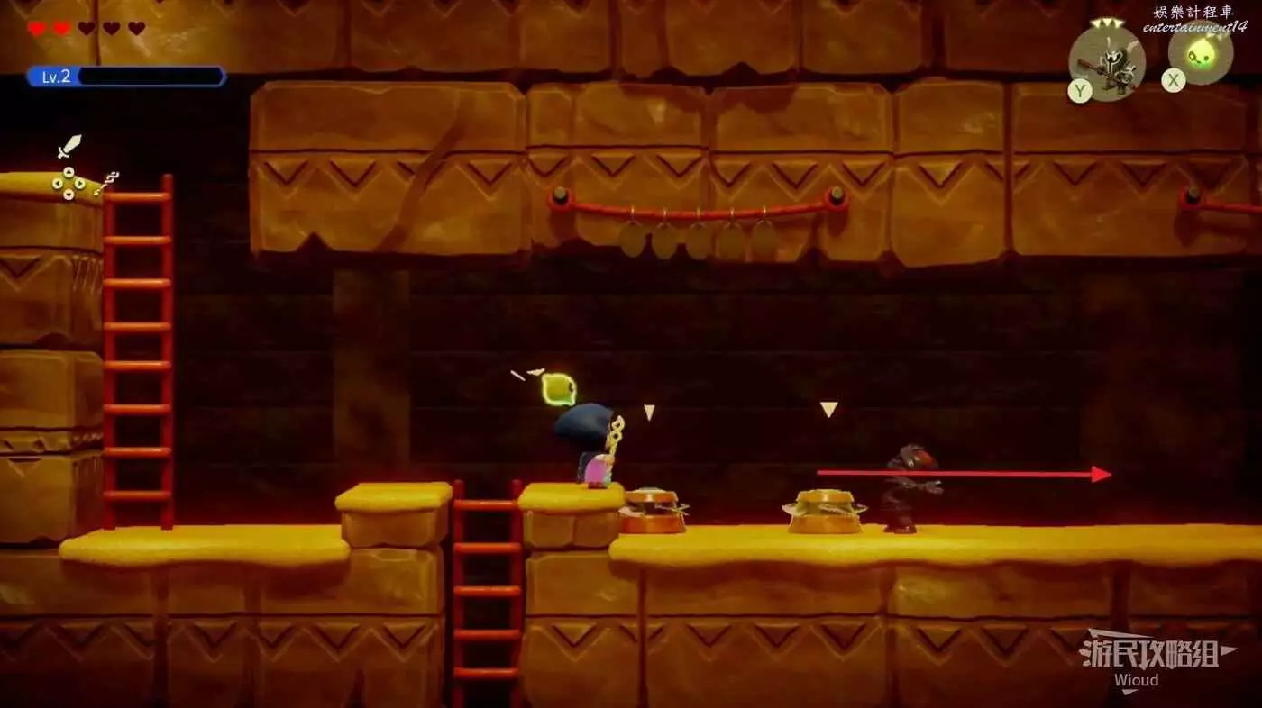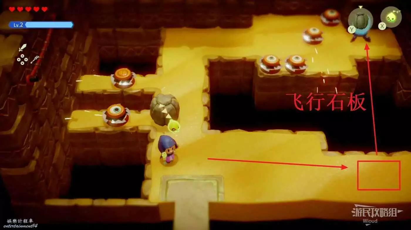 在下面放一個墜眼怪,通過右側樓梯走到右側的平台上,站在平台左側邊緣,這時墜眼怪會感應到塞爾達開始往上走。