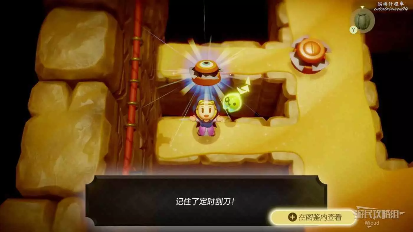 完事跳到最底層往右走,不用往右邊樓梯繞,直接在左邊的缺口放一個墜眼怪跳到右側高台邊緣,然後放置一個吹風機吹散沙堆。