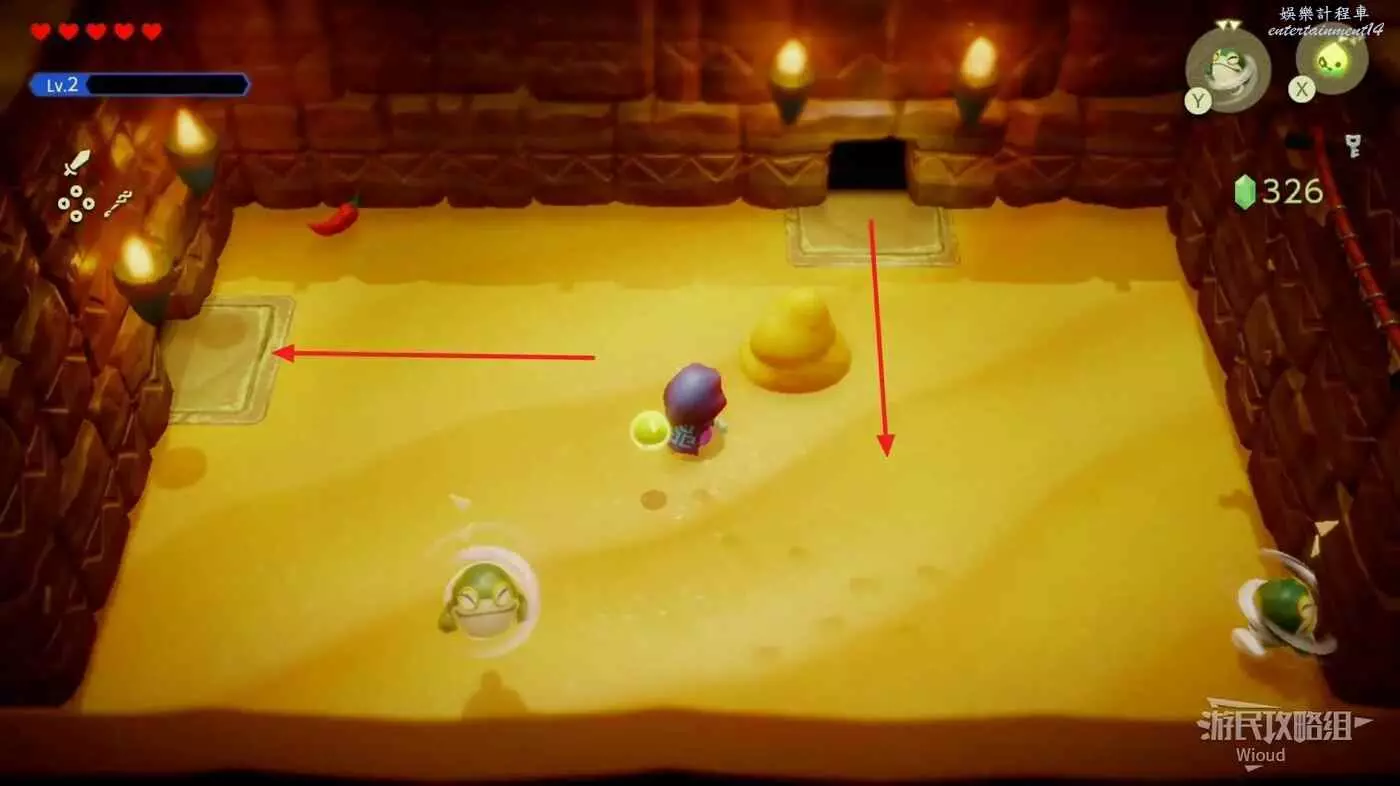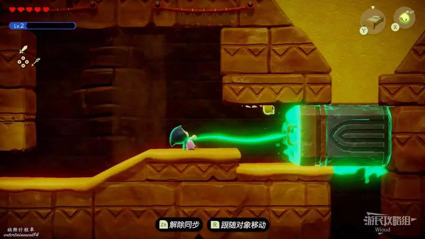 爬完樓梯往右走,這裡可以獲得一個LV2的吉波得,往右走到盡頭,使用同步能力將堵住沙子的石塊拉出來,然後往左走,爬樓梯回到迷宮的初始區域,離開這個洞穴。