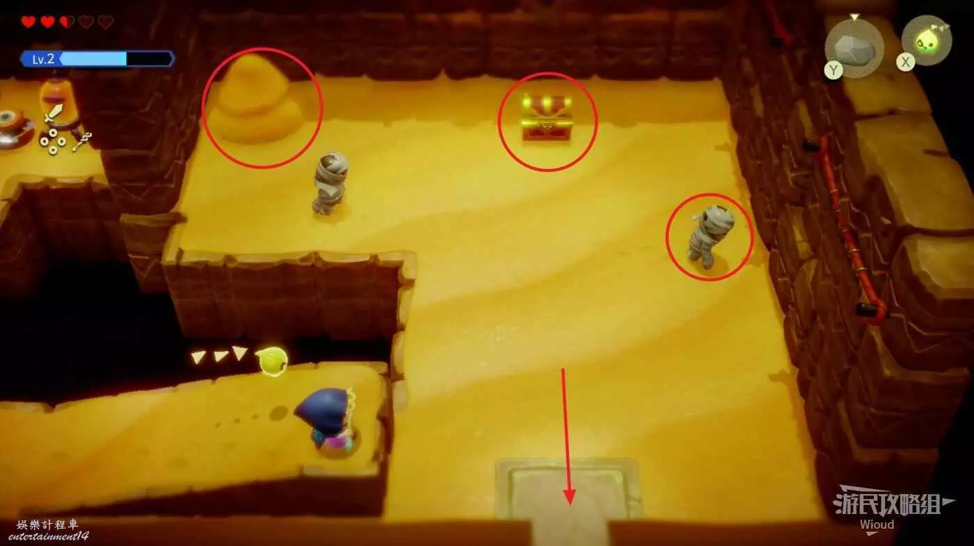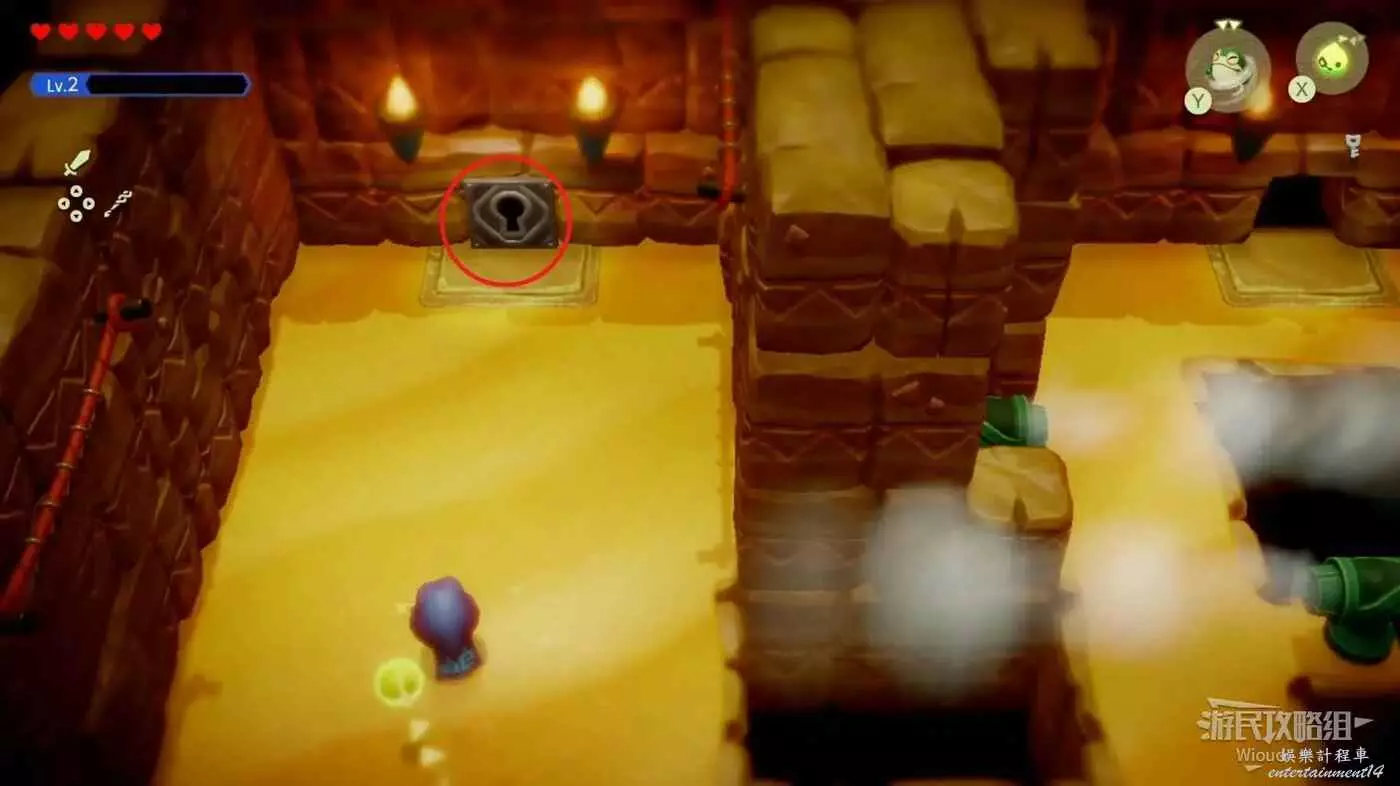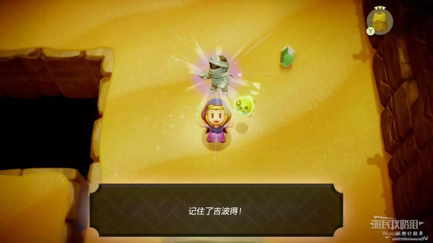 繼續往右邊走,擊敗這裡的怪物獲得複製品【吉波得】,打開上方的寶箱獲得小鑰匙,使用吹風機吹散左上角的沙子可以獲得盧比,從下面的門繼續走。