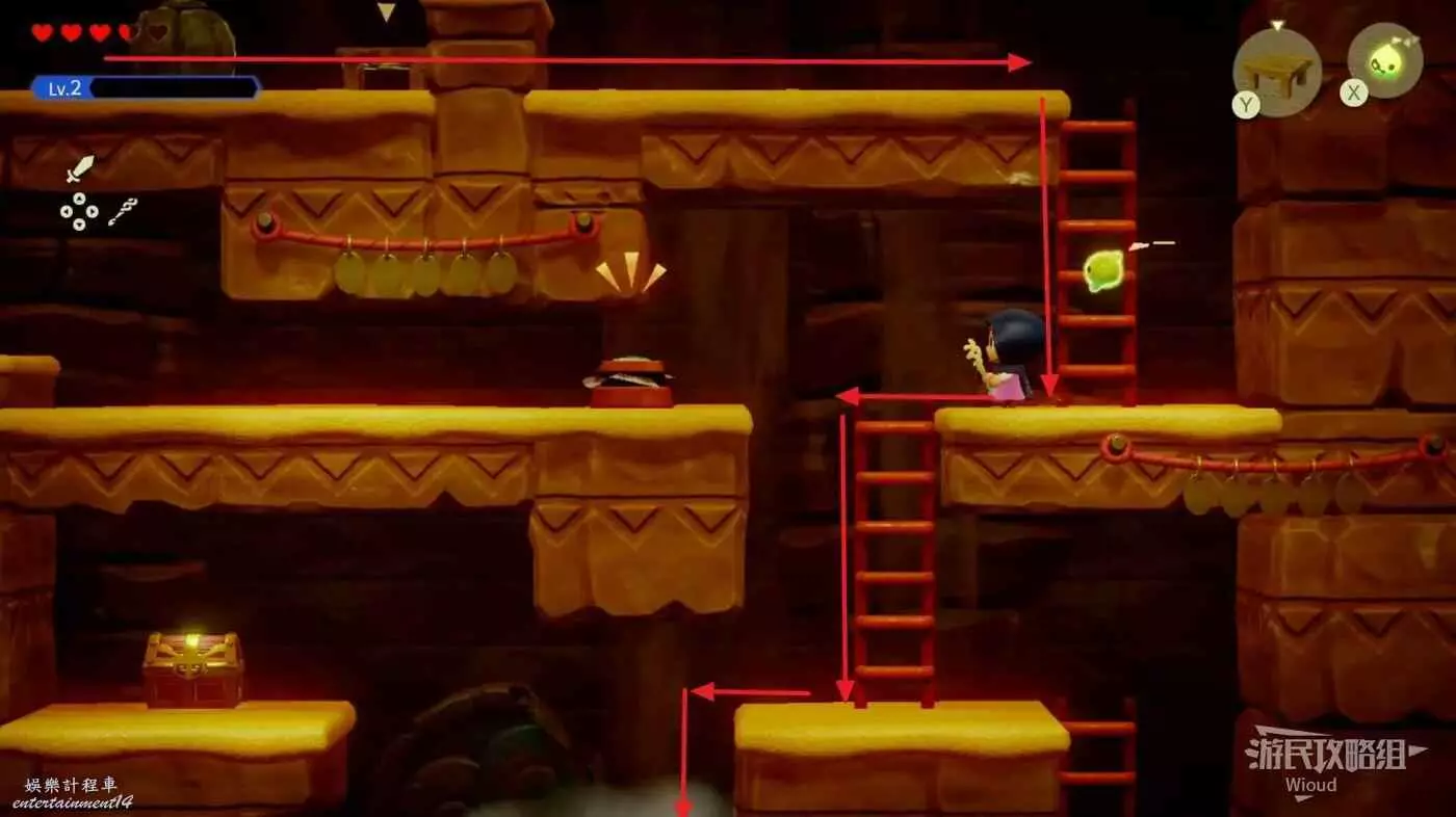 先沿著左邊的樓梯往下爬,然後往右走一段距離可以看到一個寶箱,先不要管寶箱,繼續往下走到最底層。