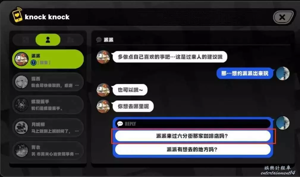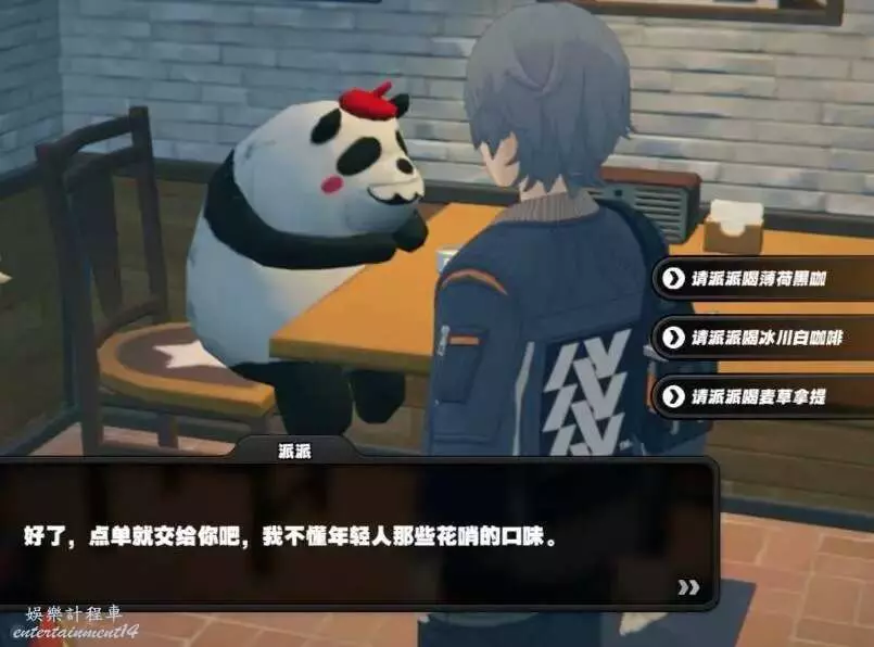 來到咖啡店之後,選擇“請派派喝麥草拿鐵”,好感度增加,選“薄荷黑咖”可能不會增加好感,最後大幅度提升。
