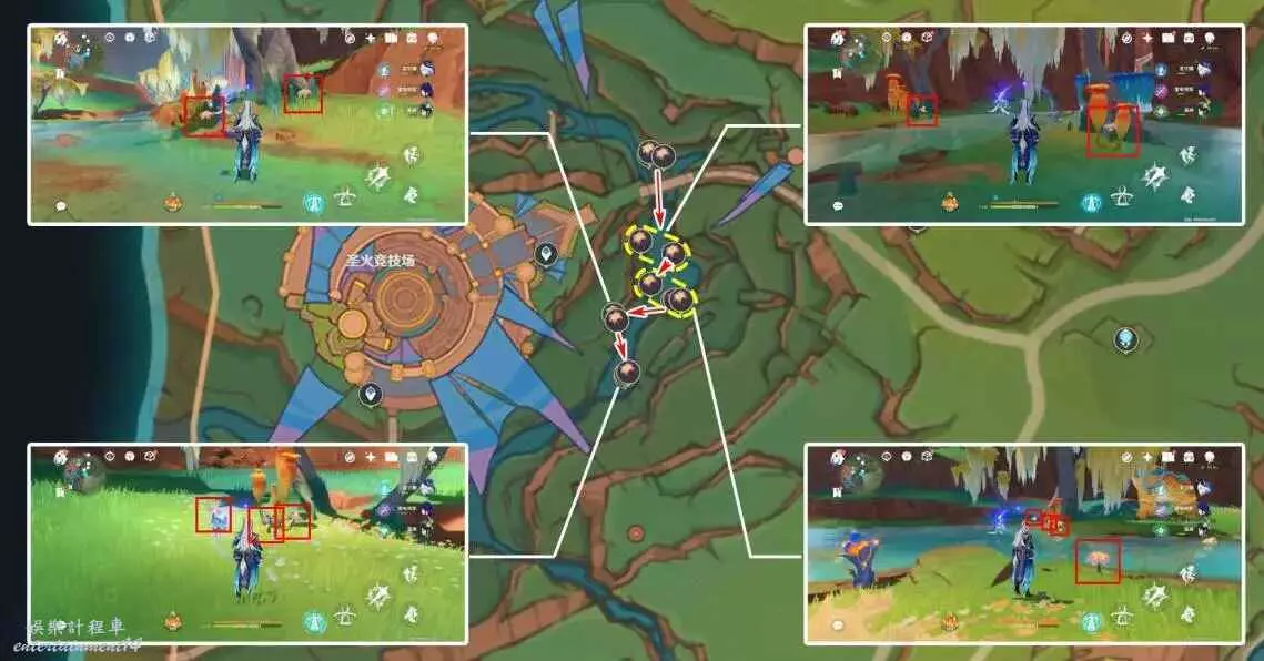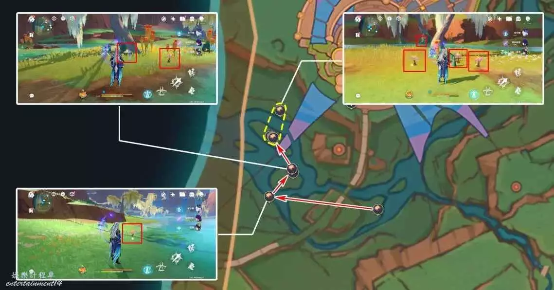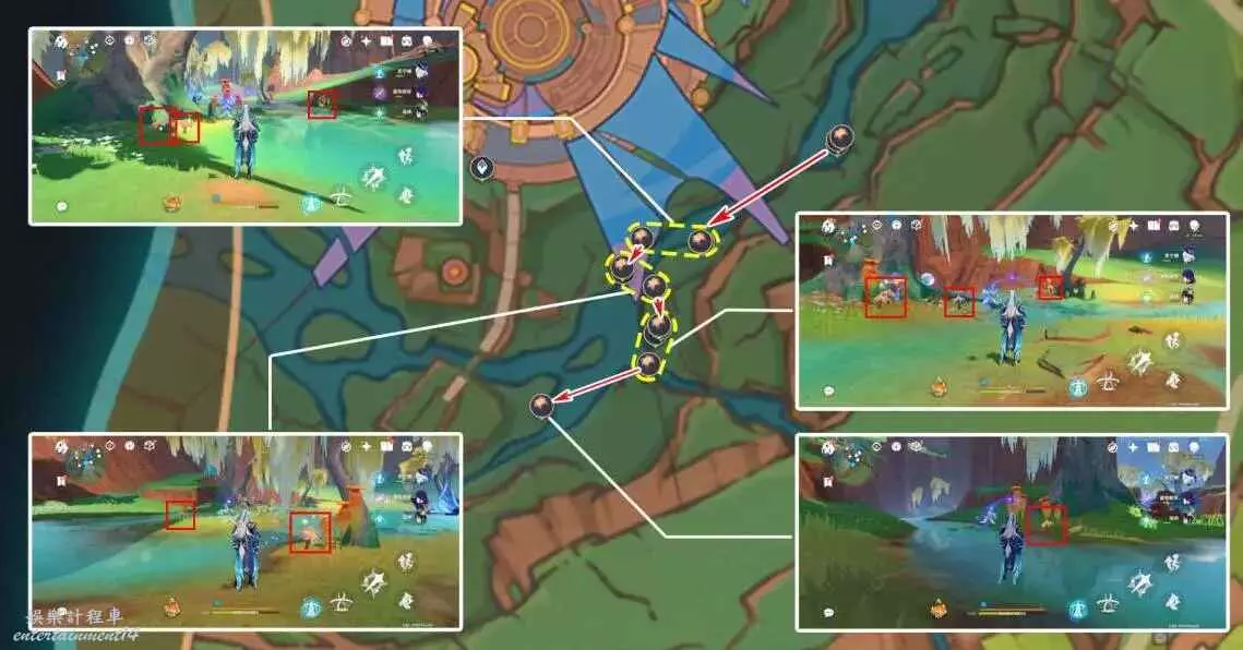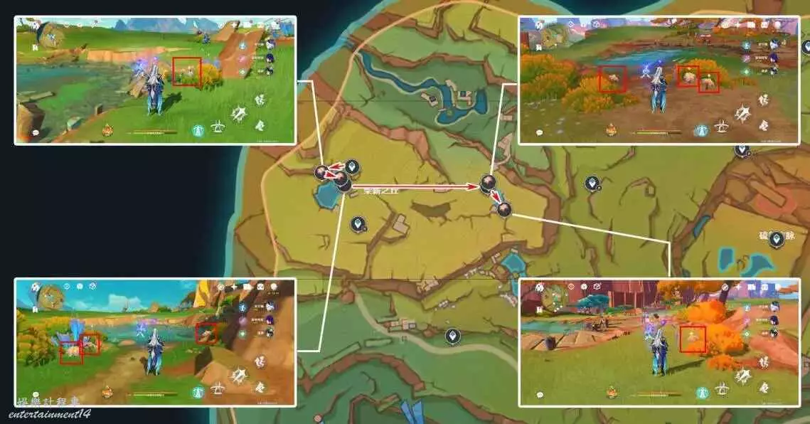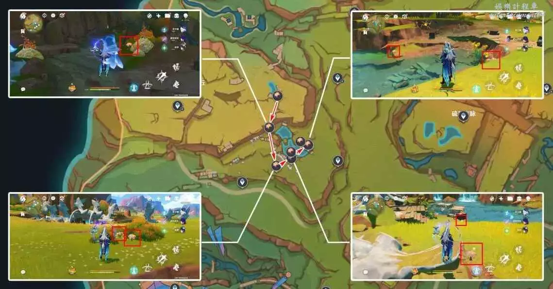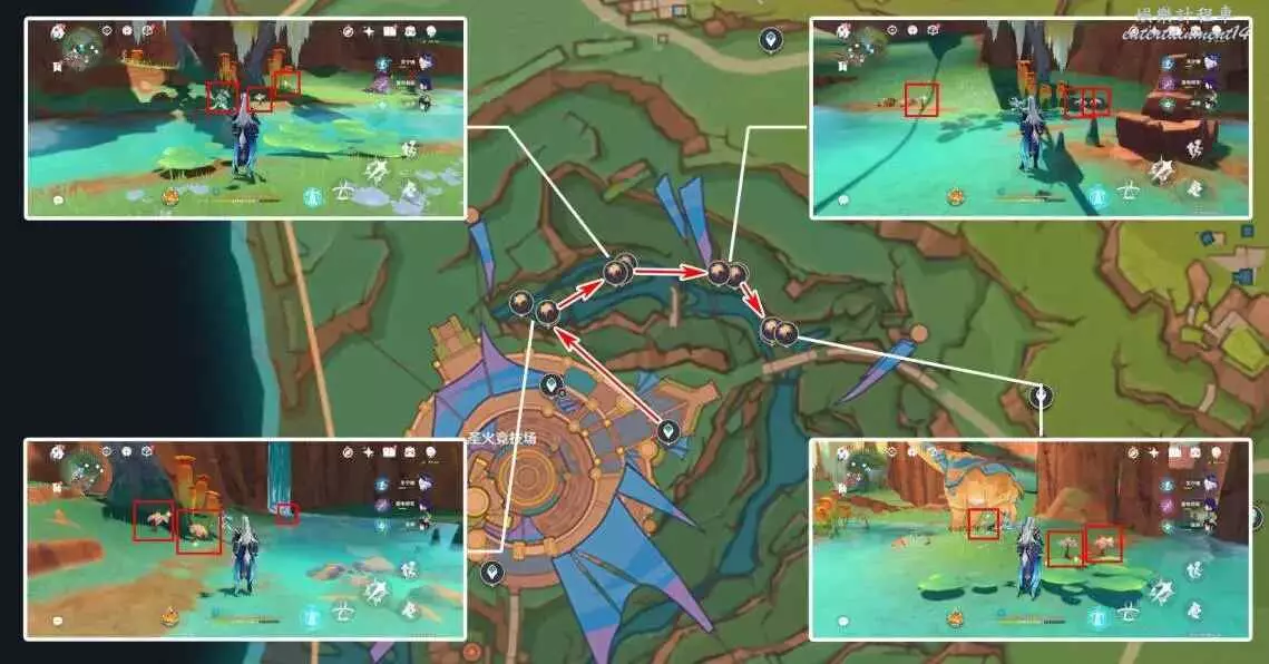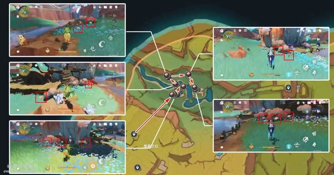 從柴薪之丘山頂傳送點出發,所有採集點均在柴薪之丘山頂的池塘邊,沿著下圖路線行進即可。