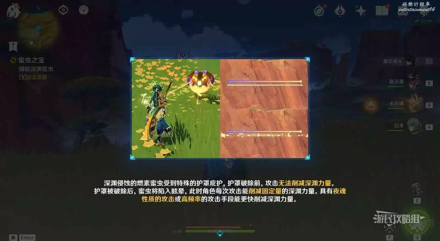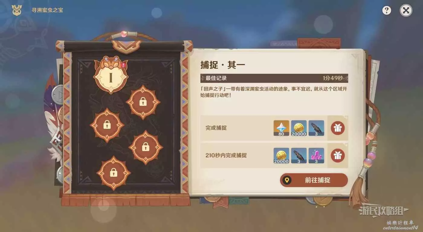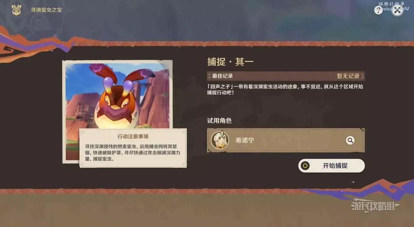 - 活動說明:活動開始後的前五天,每天會開啟一個新的挑戰。挑戰中,旅行者需要尋找並追擊被深淵力量侵蝕的燃素蜜蟲,靈活使用「捕蟲網」破除其護罩,在規定時間內削減深淵力量,捕捉蜜蟲。完成指定目標可獲得原石、武器突破素材、祝聖油膏、精鍛用魔礦、摩拉獎勵