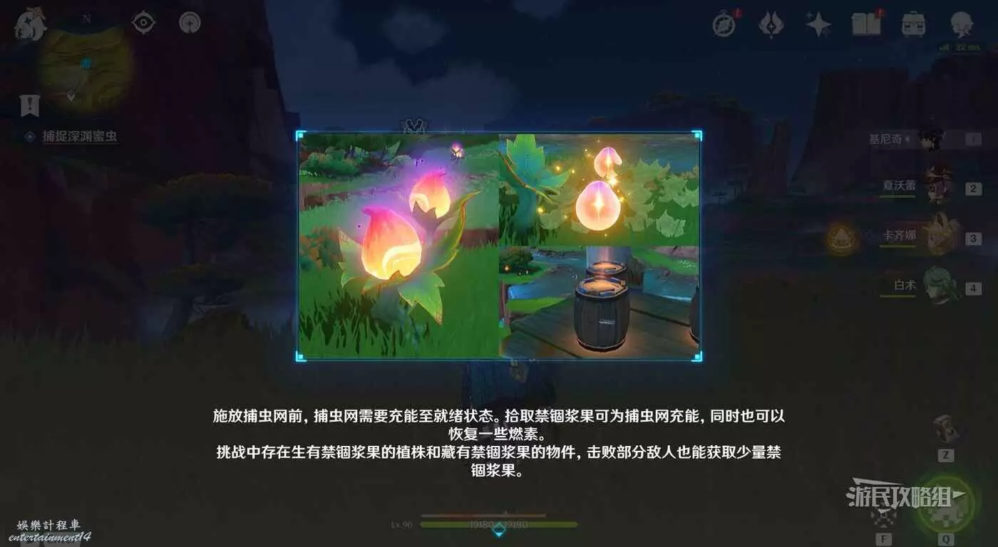第一天的試用角色是希諾甯,主要利用的是希諾甯的元素戰技進行快速移動,拾取關卡中的紫色漿果為捕蟲網充能。