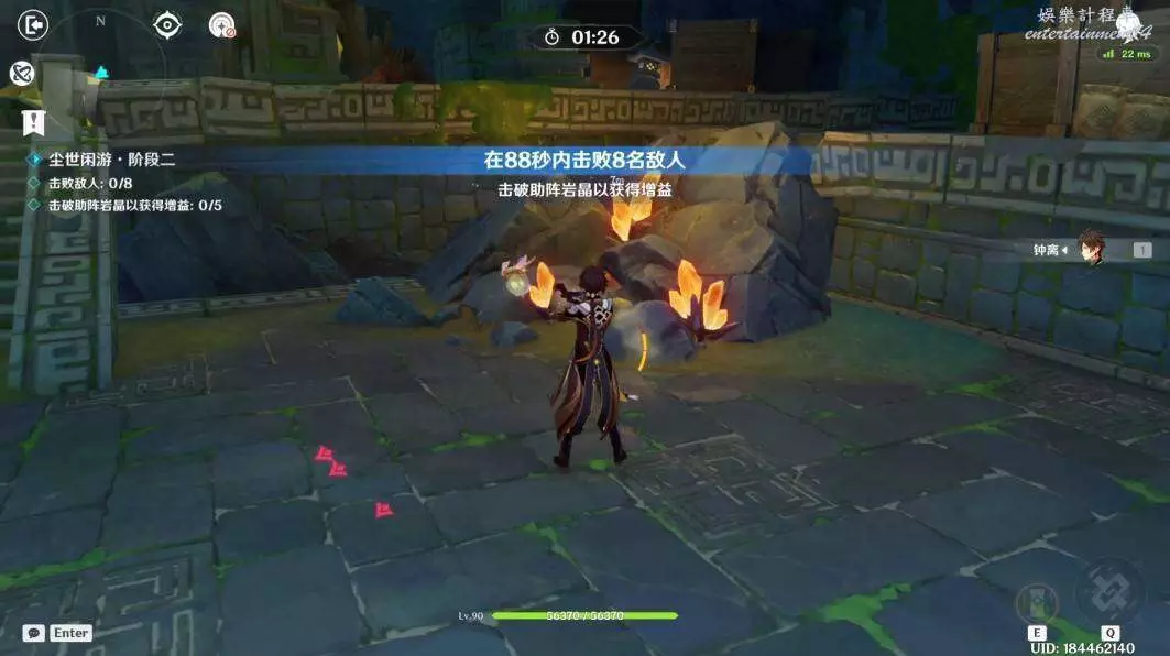 (2)戰鬥要點:可以使用長E技能或者下落攻擊岩晶獲得增益,面對第一波敵人時鐘離沒有大招能量,敵人傷害也很高,持續近身纏鬥會迅速擊破護盾。並擊殺鐘離。我們需要第一時間開盾,並用普攻持續輸出的,確保每4.5秒都能準時發出衝擊波。並注意及時補充護盾。在四次衝擊波過後即可消滅他們。