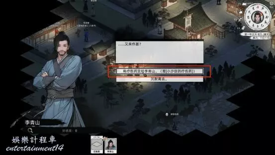 交付金瘡藥後,得知劍客名為李青山。經過十二個時辰的打坐,再次和他對話,將遭遇地痞流氓的挑釁。李青山目睹我們擊敗地痞後,向我們透露了李二狗與連雲寨勾結,在趙雲靈離城的時候將其劫持至寨中,而自己則因丹田被廢而無法救出趙雲靈。我們得知之後十分憤慨,於是承諾將解救其妻子趙雲靈。