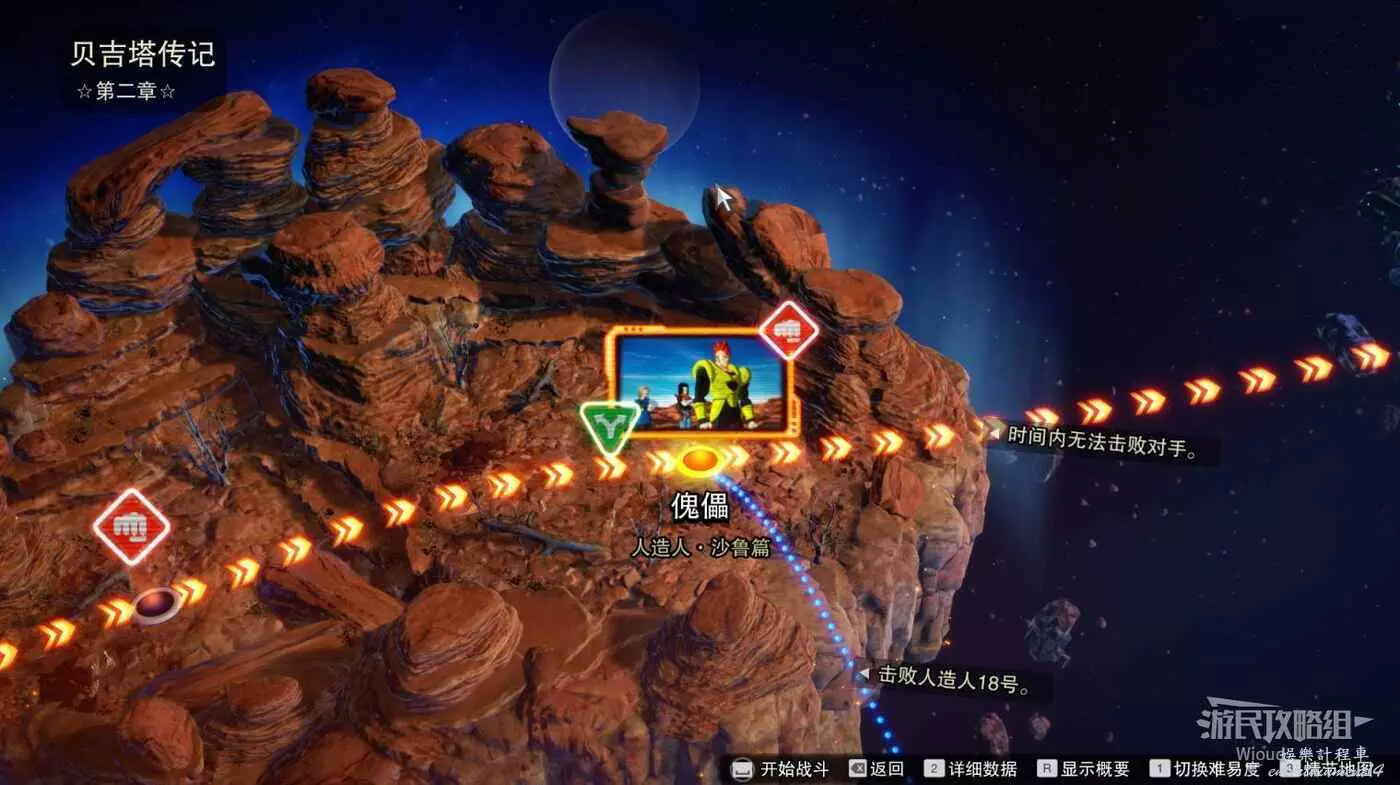 【賭命爭取時間】關卡迅速擊敗魔人布歐會進入分支劇情【戰鬥民族賽亞人】,在戰鬥中與魔人布歐消耗一段時間進入分支關卡【貝吉塔靈機一動】。