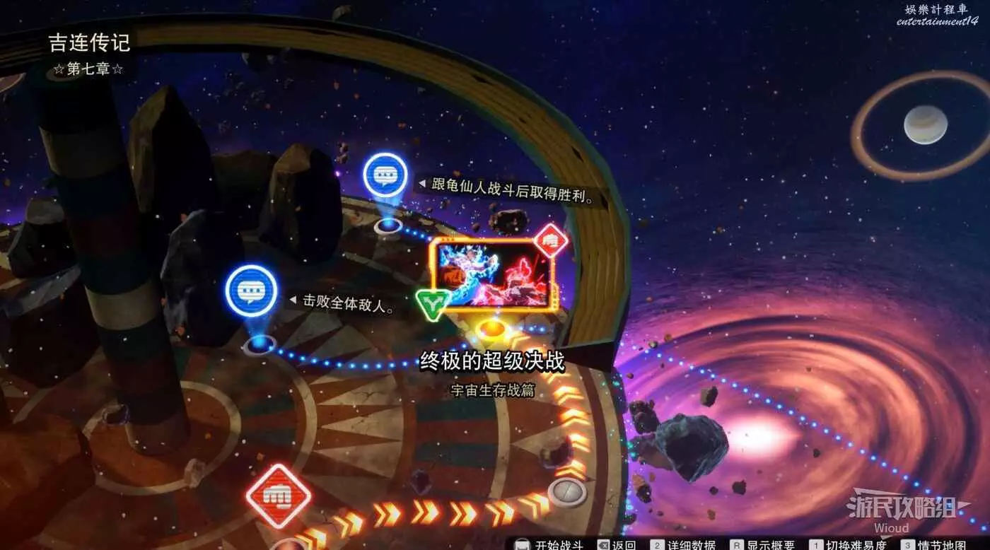 【宇宙生存戰】的第一關選擇【解決凱露】進入主要劇情線【第7宇宙的第一戰士】,選擇【觀察狀況】進入分支劇情線【真正的強大】。