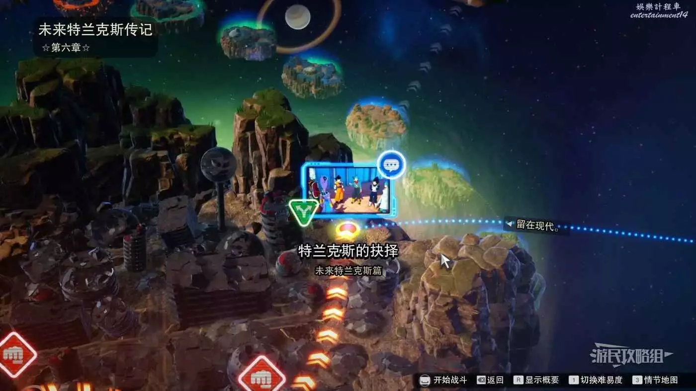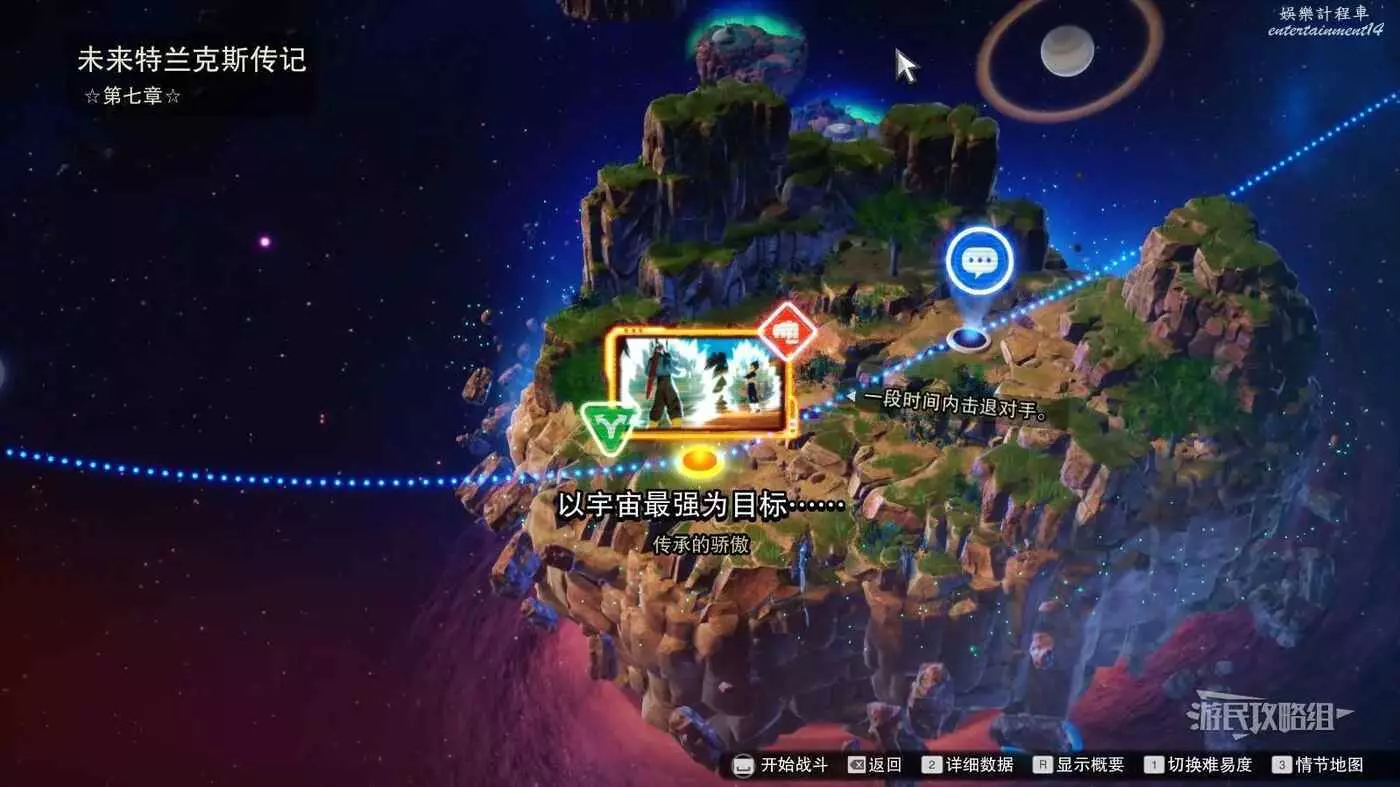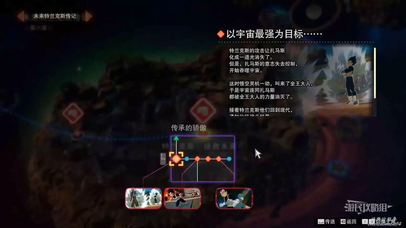 步驟2:進入關卡【以宇宙最強為目標……】,在一般難度下擊敗貝吉塔、比克和悟飯,要在3分鐘內將對手的血量削減至大約一半才能完成這場戰鬥並進入分歧路線。戰鬥結束後觸發悟飯說【特蘭克斯……我完全打不過你啊】表明成功進入了分歧路線。