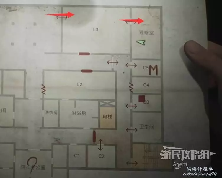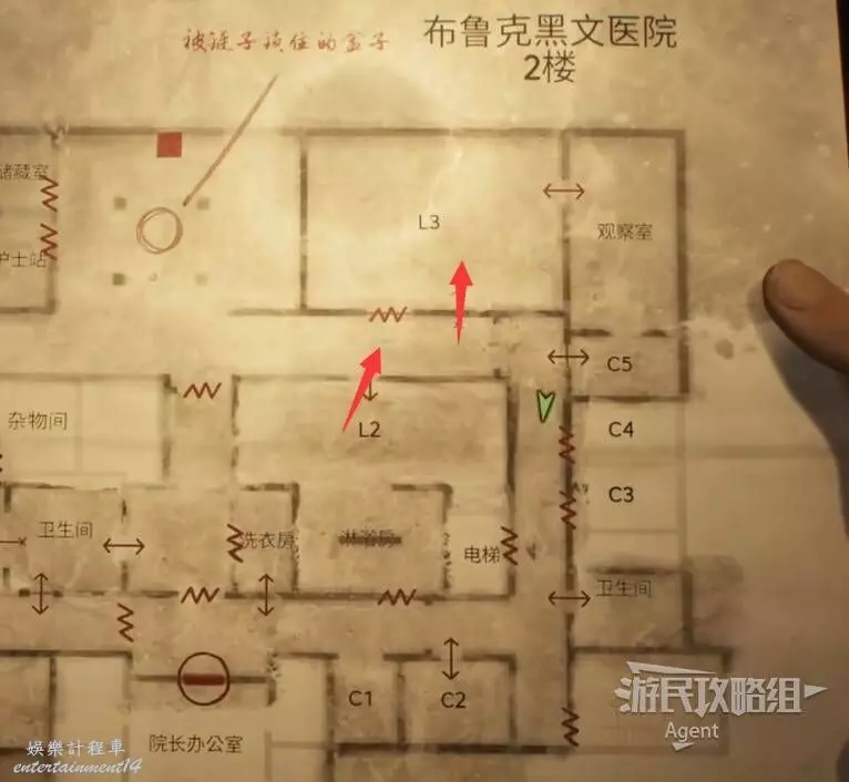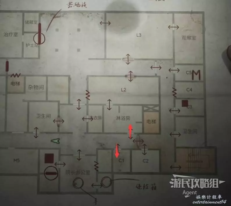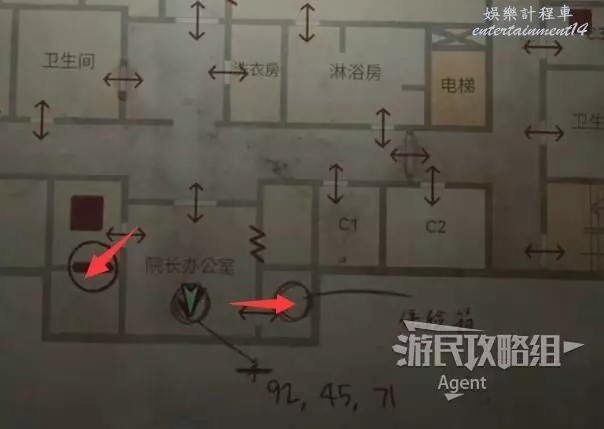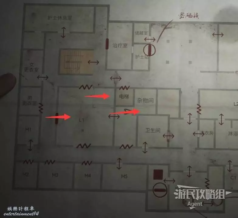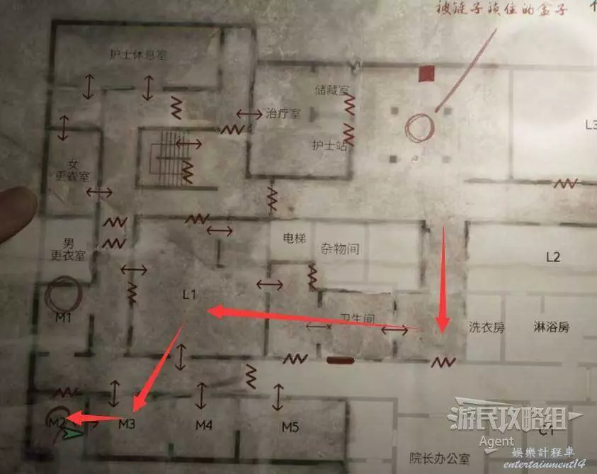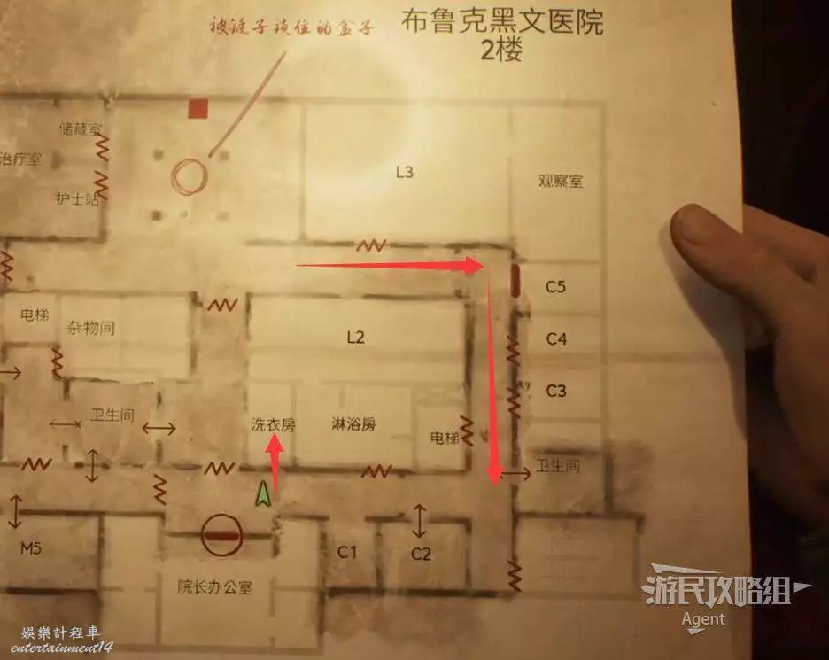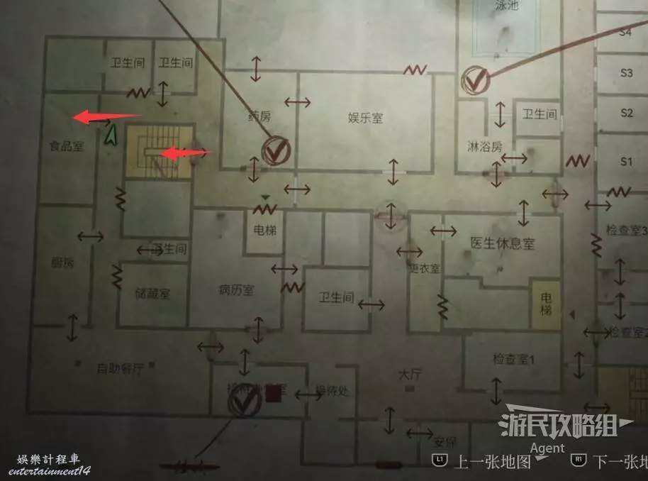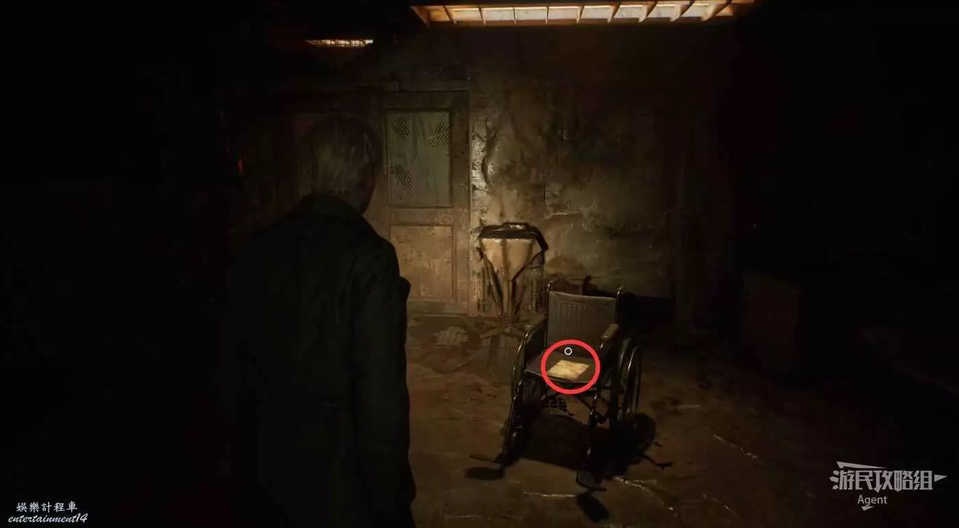 搜刮衛生間、食品室、廚房、自助餐廳,然後經過儲藏室、病歷室,到下圖圈出位置的牆洞裡,拿到【極樂之鑰】。