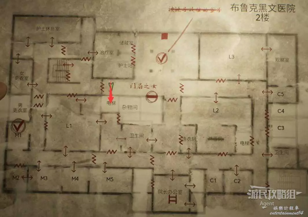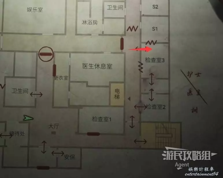 經過護士站、治療室、護士休息室,女更衣室可以鑽牆洞進去搜刮。