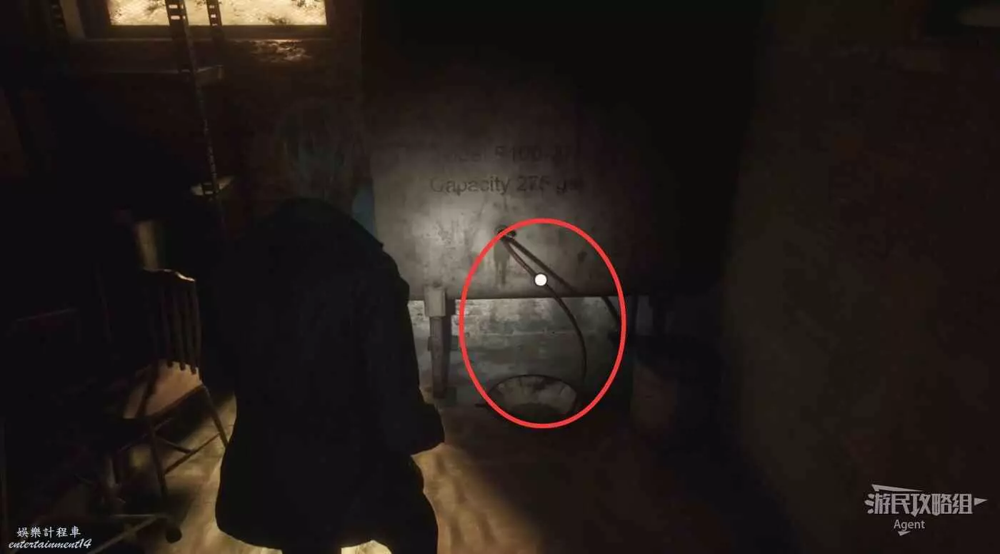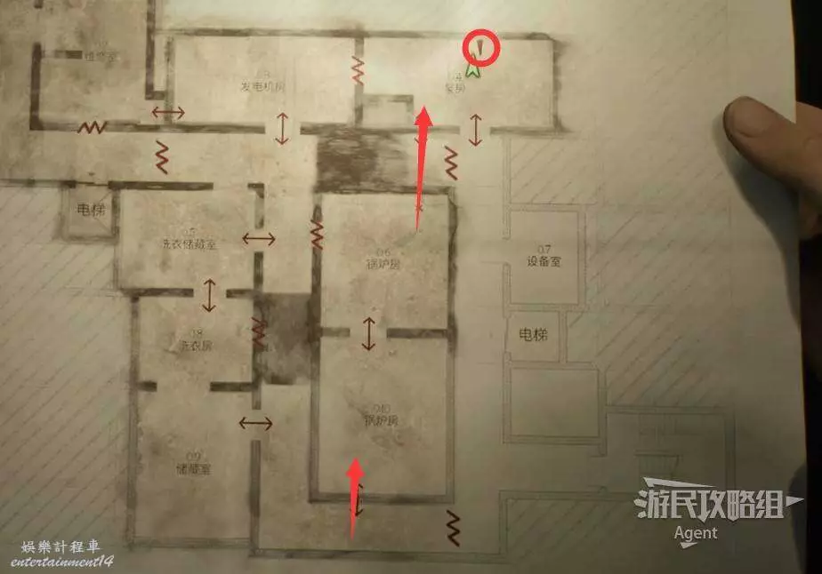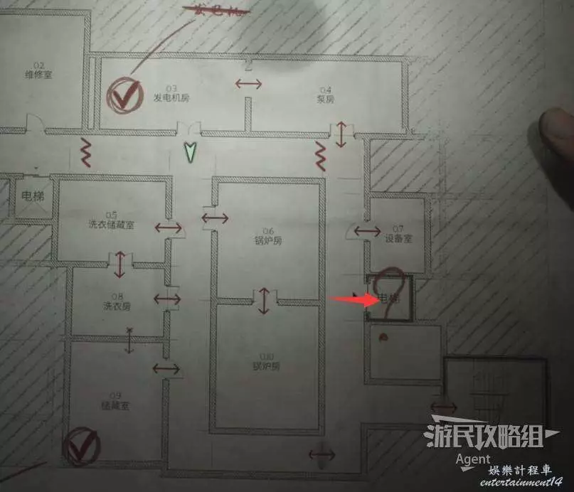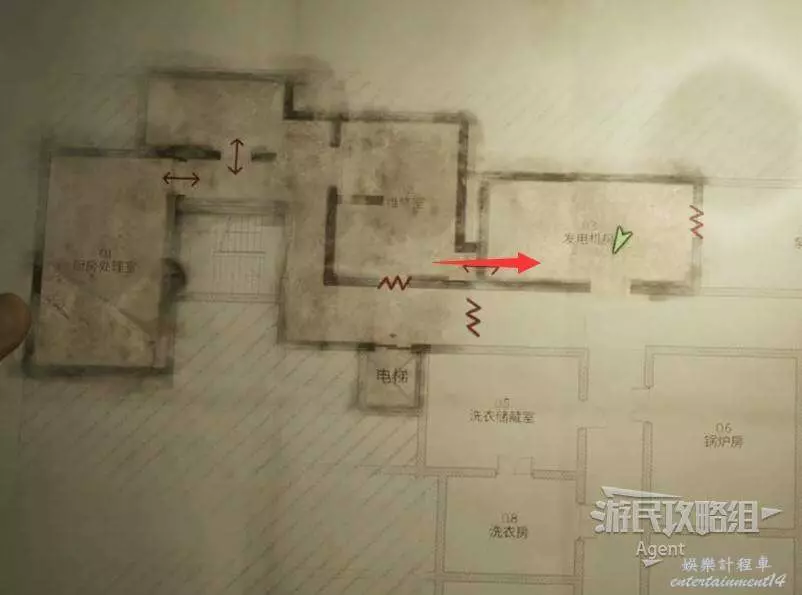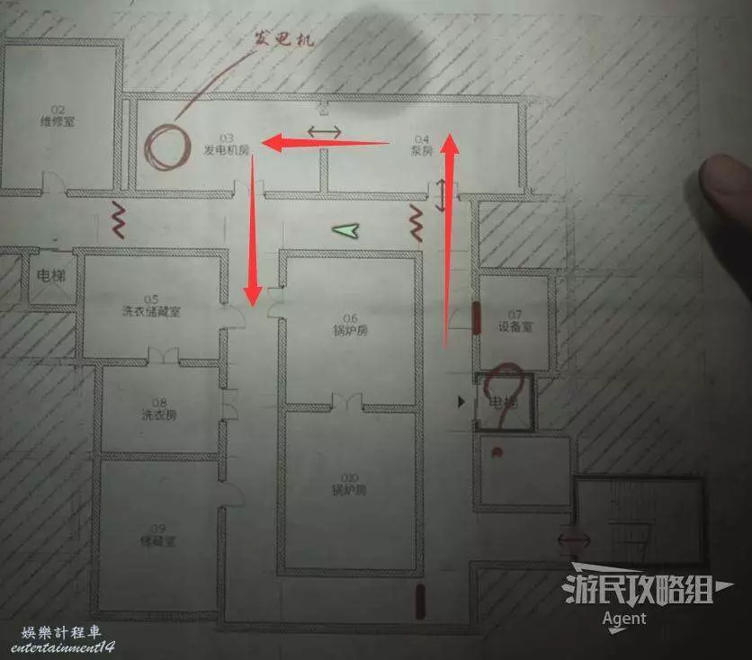 來到地下室,搜刮維修室、廚房處理室,從維修室鑽牆縫來到發電機房。