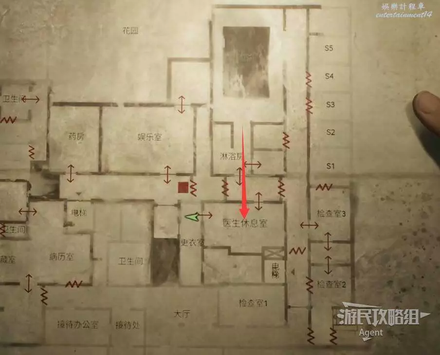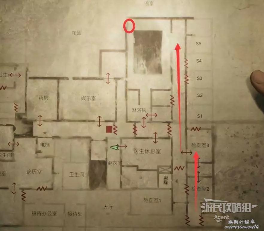 搜刮下更衣室,然後經過娛樂室、藥房,來到花園。
