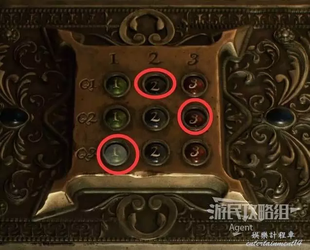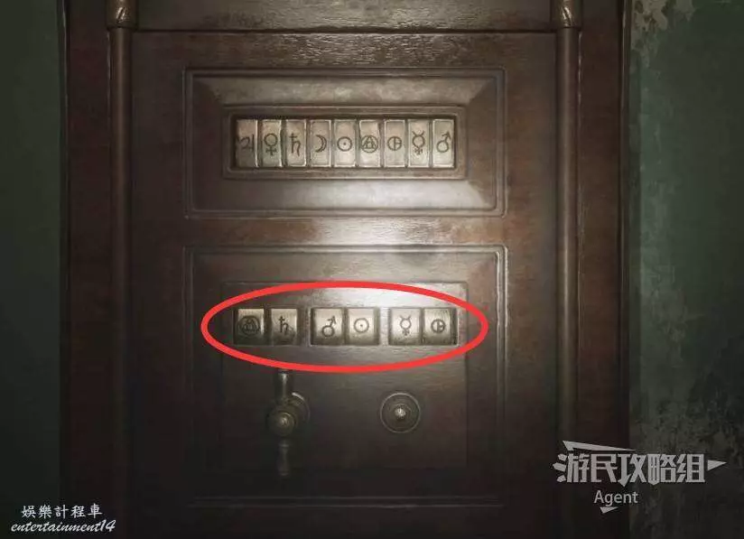 先去西面儲藏室,拿到【保險箱按鈕】。調整書架上的書的位置,拼出獅子圖案,得到特殊符號與數位的對應表。