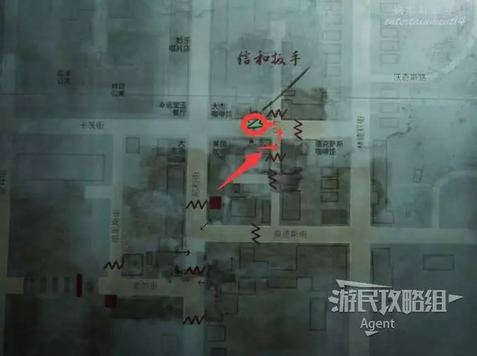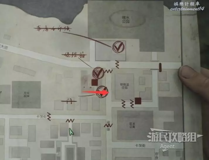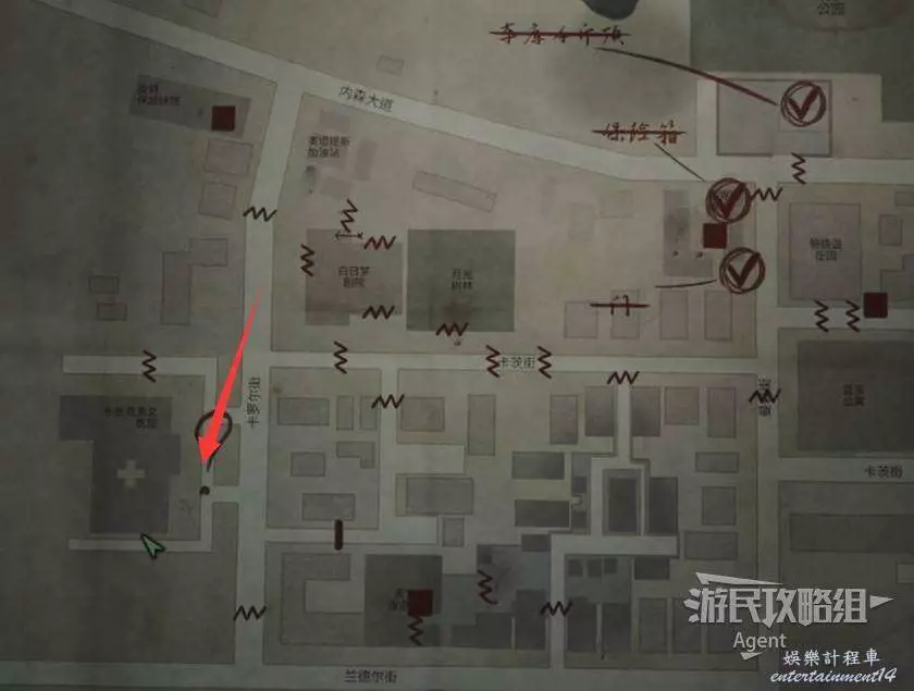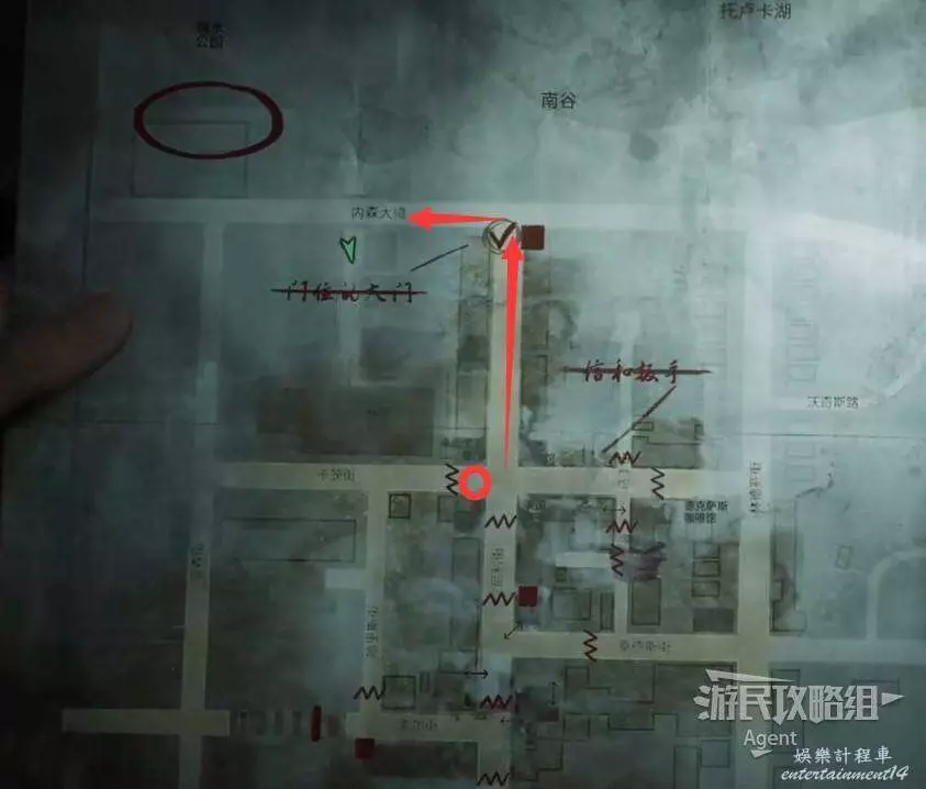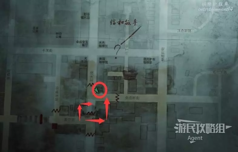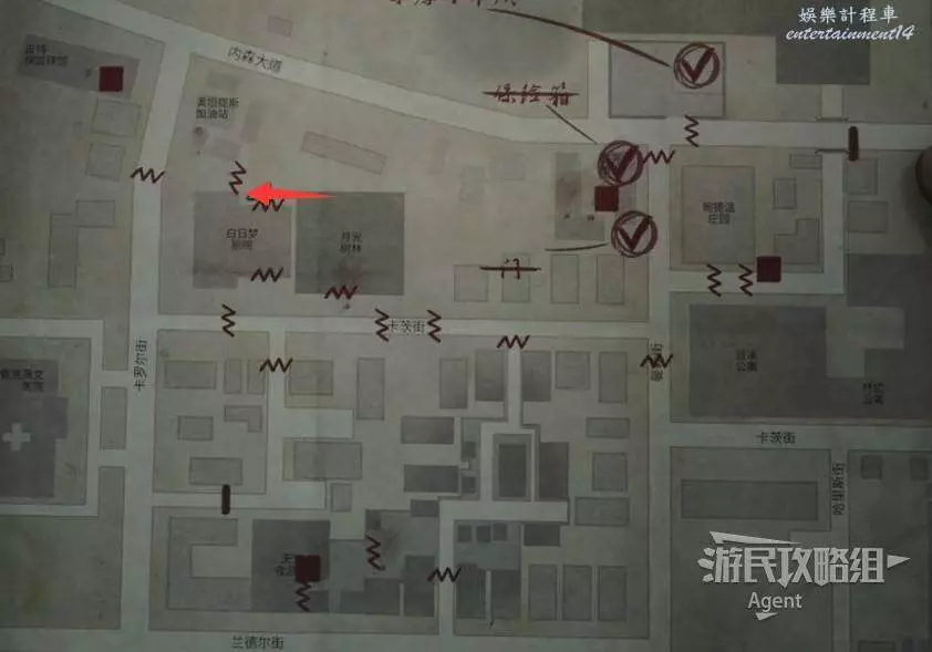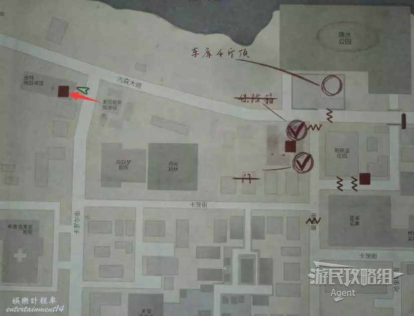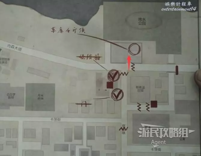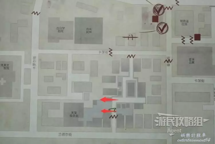 這塊區域怪比較多,往南走到下圖位置,從車庫或者推櫃子都能往西前往天堂夜總會。