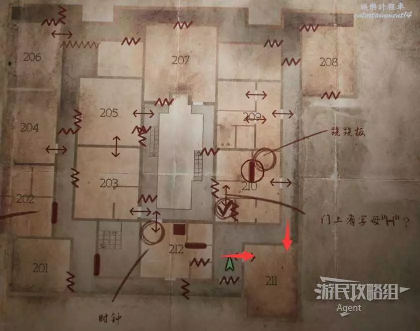 目前手上只有時針,把時針放到時鐘上,轉到9點,標有H的210房門就開了。