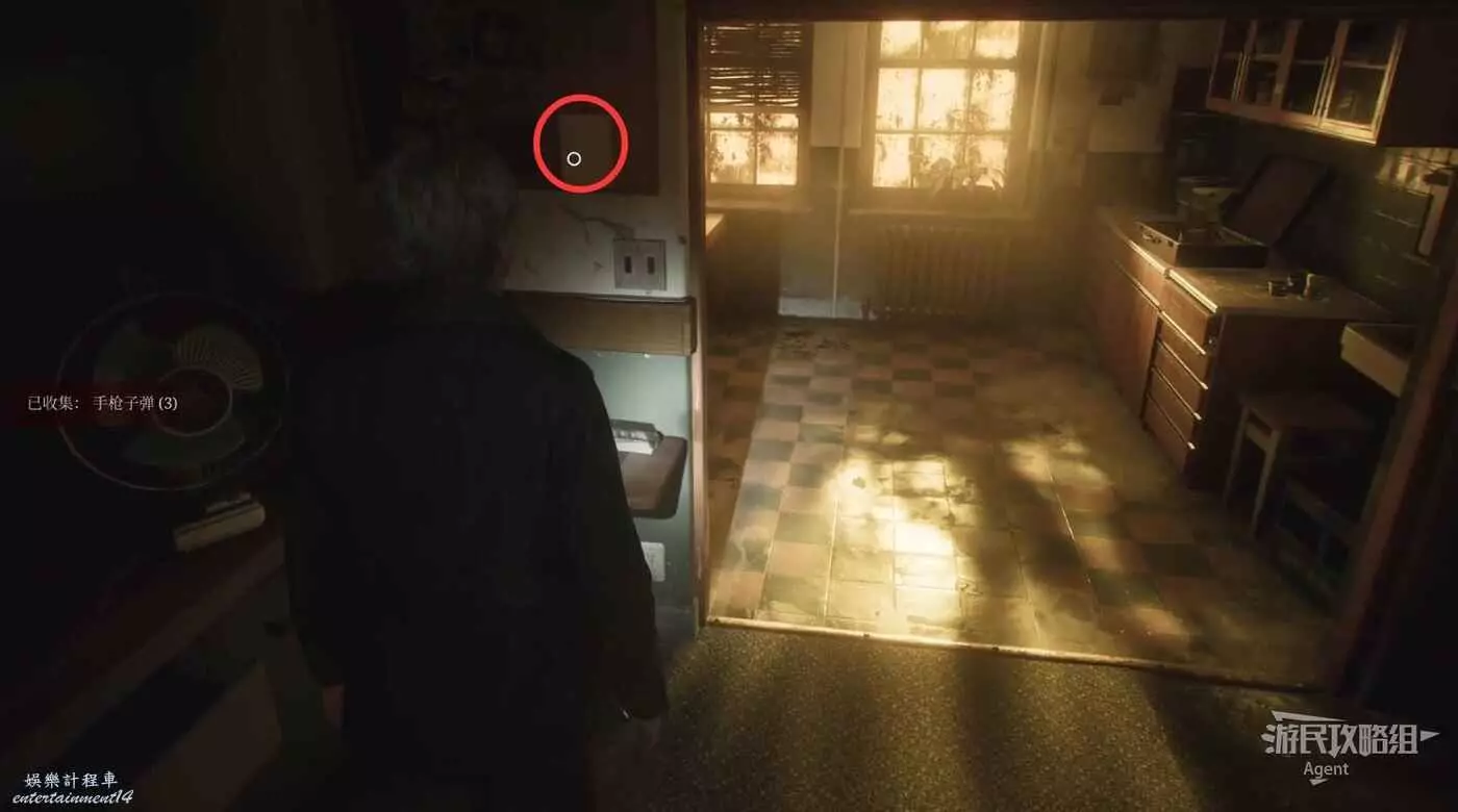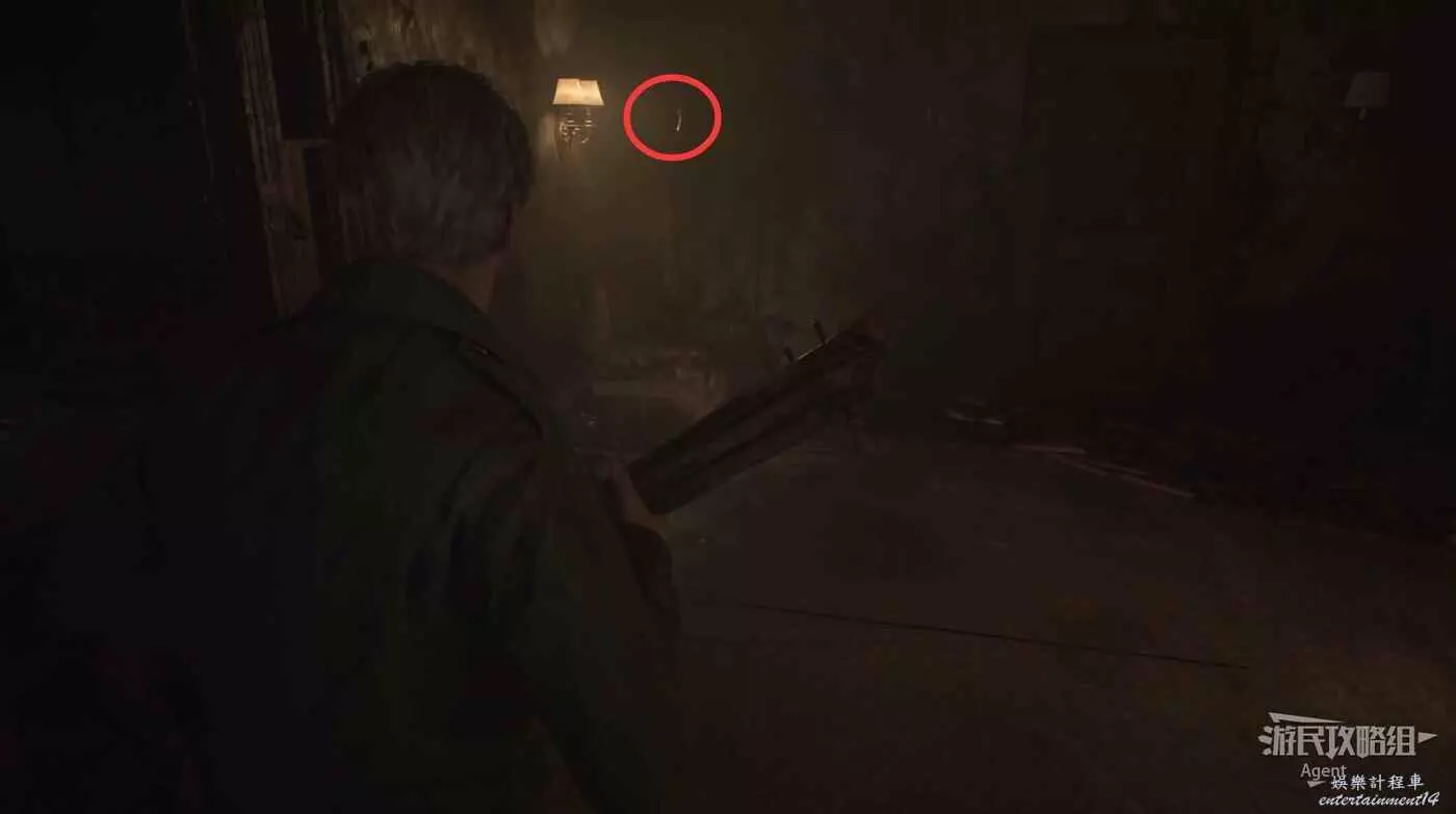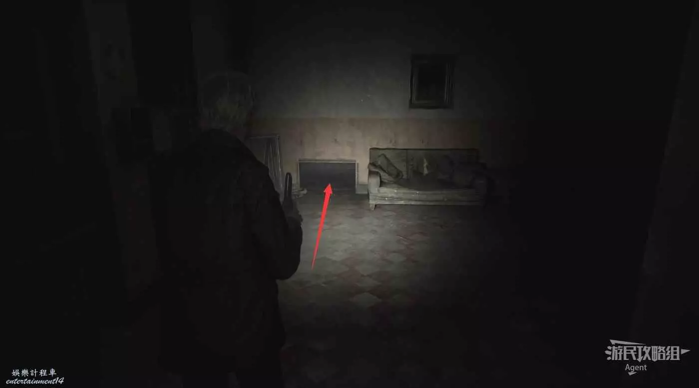 到南面走廊,開門來到中間看到門上有字母S,旁邊沙發上有手槍子彈。
