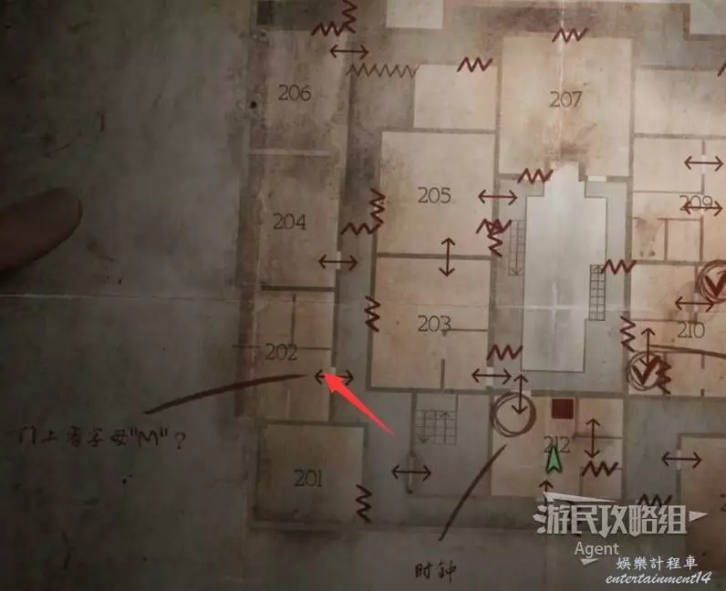 回到212房,把分針放到時鐘上,並把分針轉到2點方向,標有M的202房門就開了。