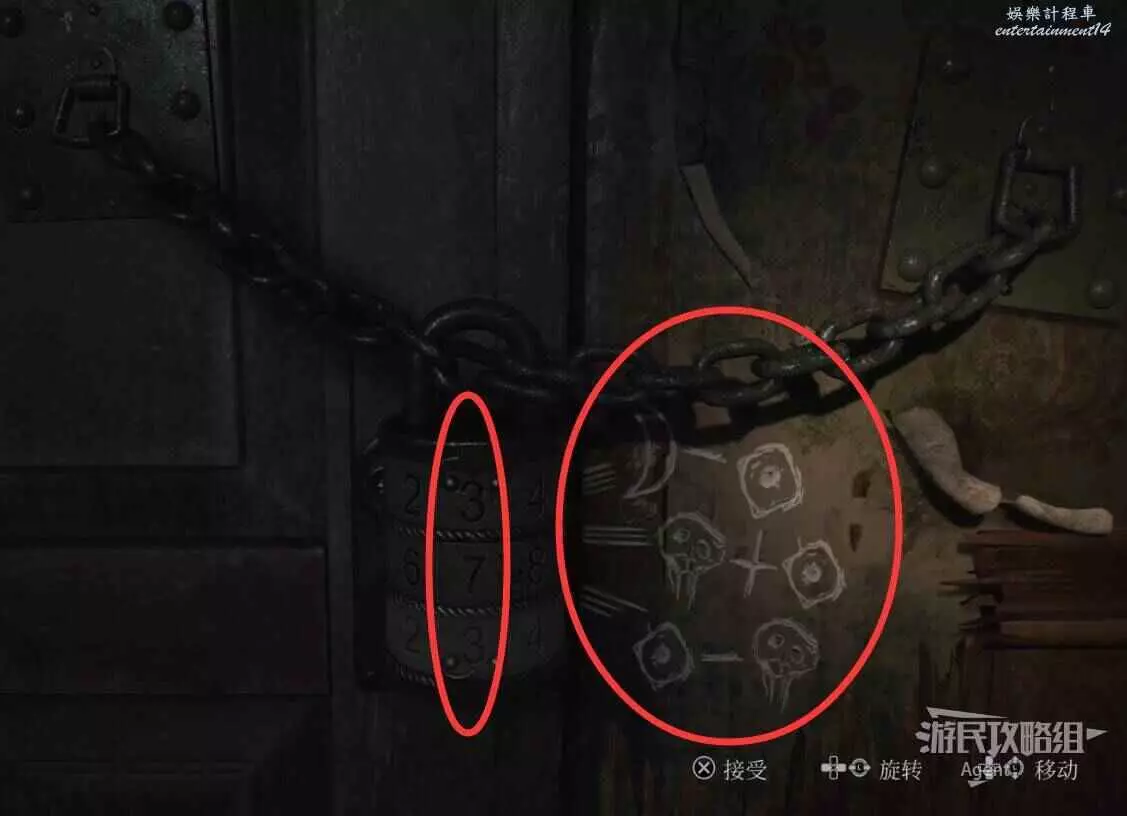 然後來開密碼鎖,根據密碼鎖旁的圖案,8-5=3,2+5=7,5-2=3,所以標準難度下密碼為373。