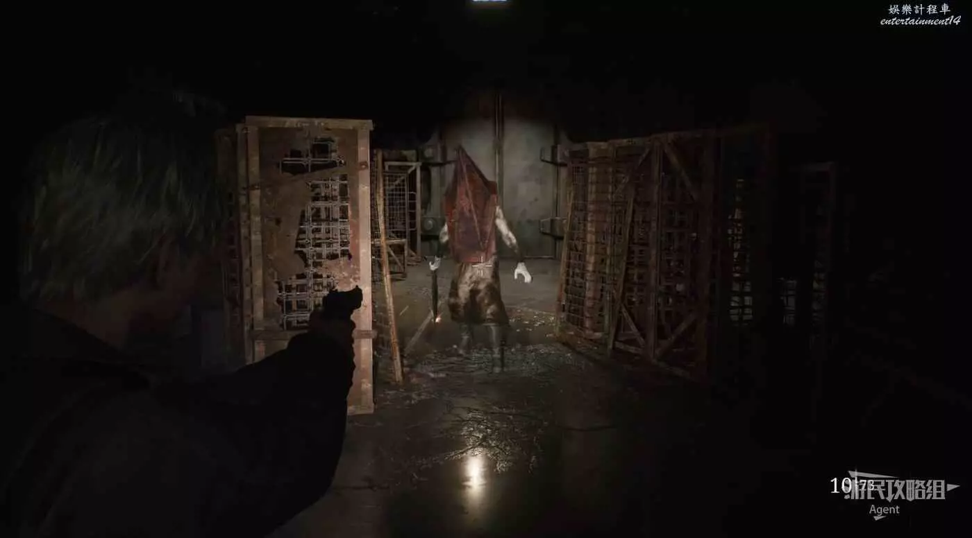 不要硬剛三角頭,儘量跑遠些保持距離,再朝他開槍。多利用周圍的鐵籠子阻礙他的移動,當他離你非常近並正要舉刀時,應迅速躲避開。