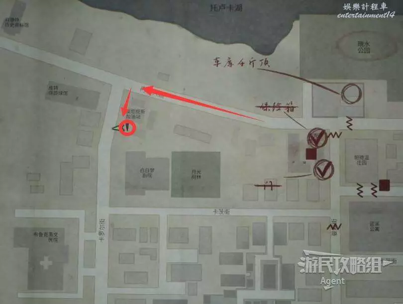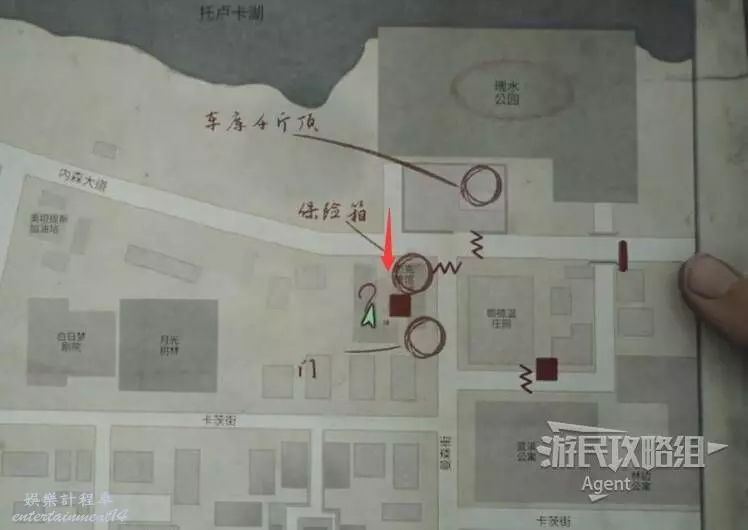 用推車翻牆出來,來到湖畔餐廳。穿過湖畔餐廳後繼續向東去追小女孩。