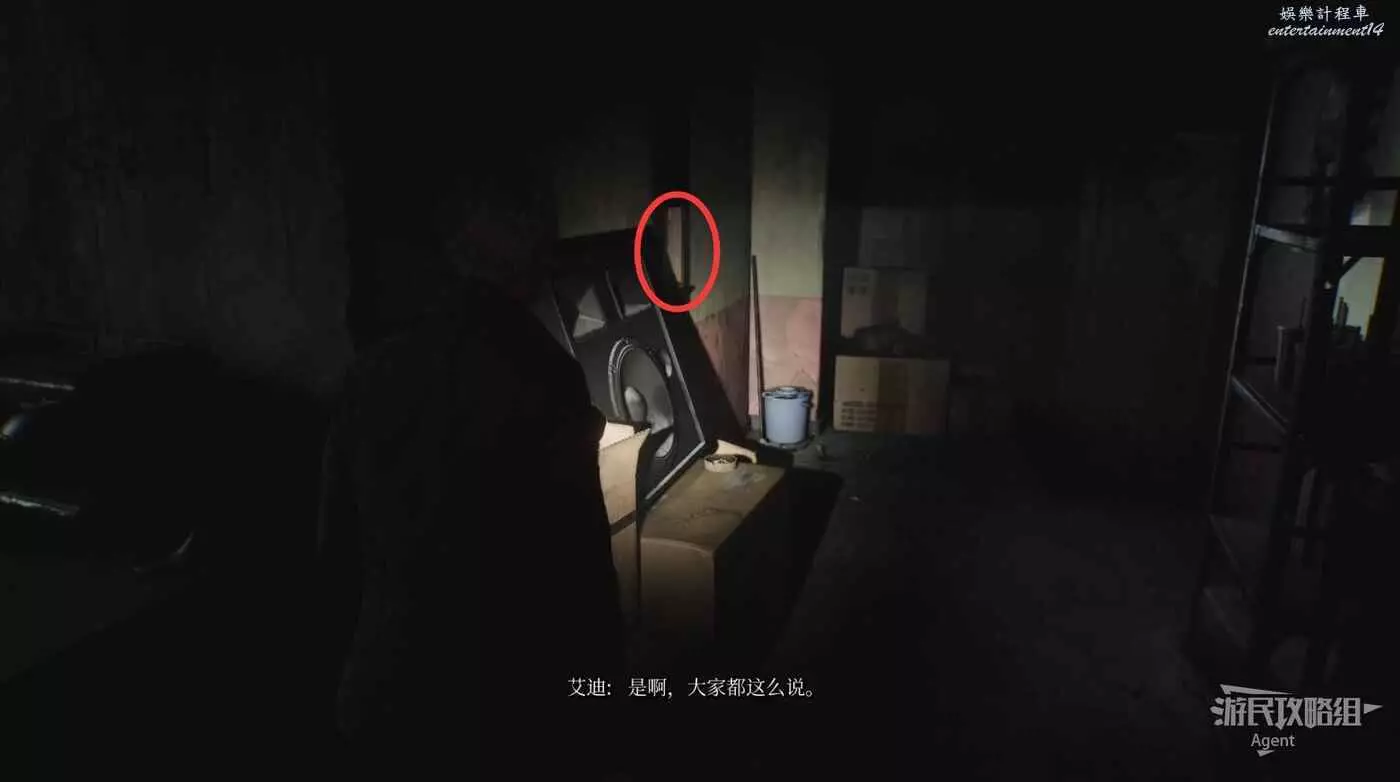 進來聽到艾迪和小女孩的對話,從牆洞可以看到他倆坐在劇場的座位上。當你推開櫃子發出聲音後,小女孩聽到聲音會走開。