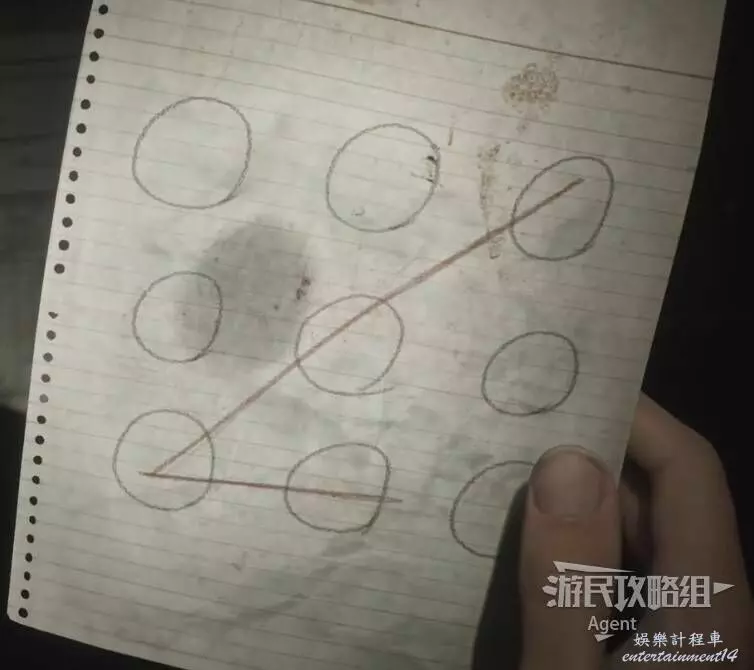 來開保險箱,把按鈕放放上去,然後根據手腕上的數位92-45-71,用對應的特殊符號打開保險箱,得到【樓頂鑰匙】、【備忘錄】保險箱字條。