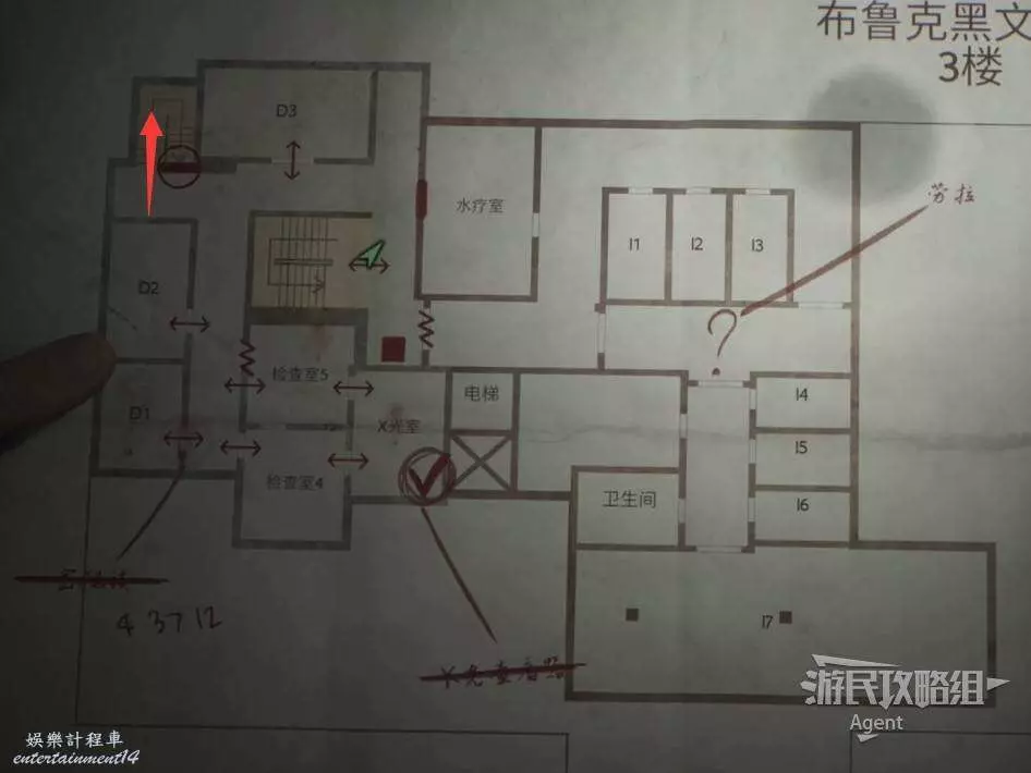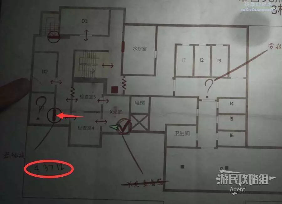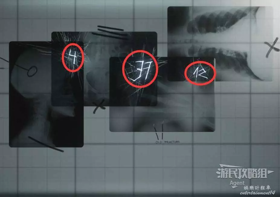 到三樓X光室,根據黑筆劃的痕跡,把四張X光片按下圖擺放,得到密碼。數字不好認沒關係,地圖上會寫。