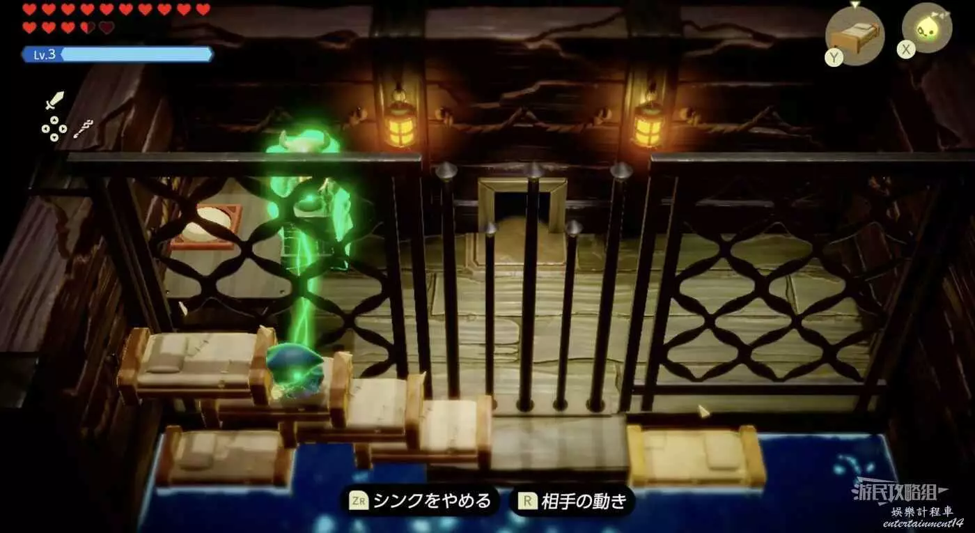 在海濱村與黃色小船頂上的船長對話,接取迷你挑戰【啪哩啪哩和遇難船】。參考上文地圖位置進入遇難船,利用同步能力往地牢深處走。