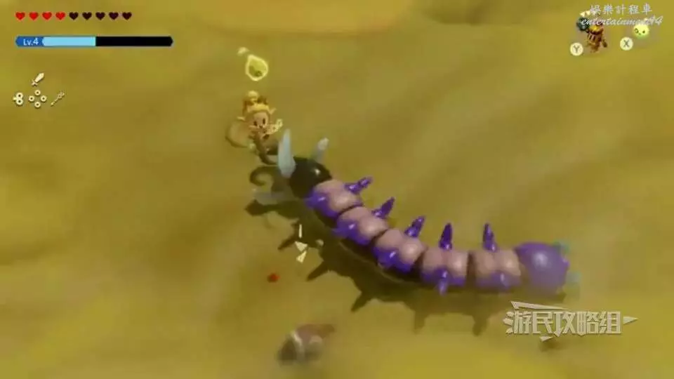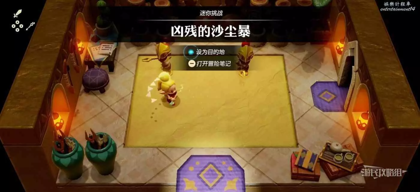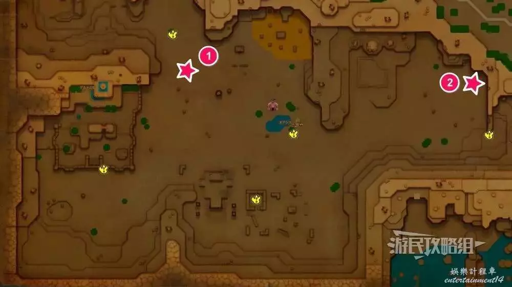 格魯德沙漠中最早出現的2只拉內莫拉位置如下圖星標所示,前往標記位置後可以看到一個凸起的沙堆,吹走沙堆即可觸發與拉內莫拉的戰鬥。擊敗兩隻之後返回格魯德小鎮的格魯德宮殿與士兵對話接取迷你挑戰,再次前往下圖②號星標位置擊敗新的拉內莫拉,獲得一個心之碎片,返回格魯德宮殿再次對話即可完成挑戰。