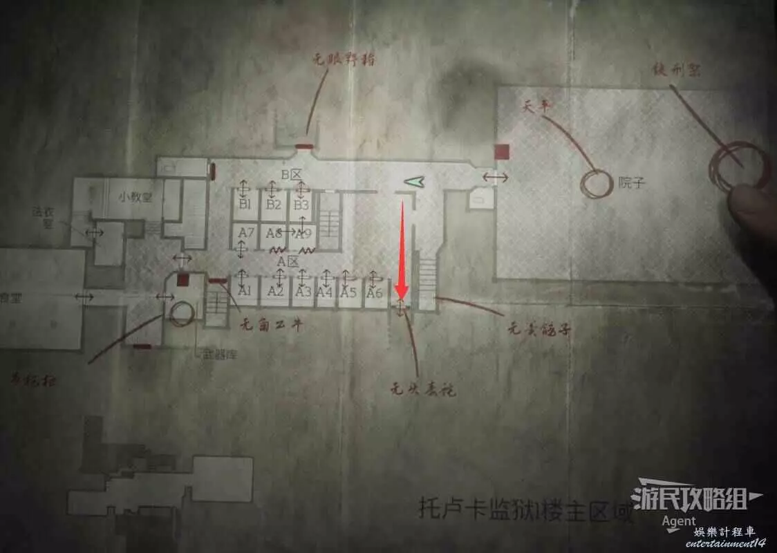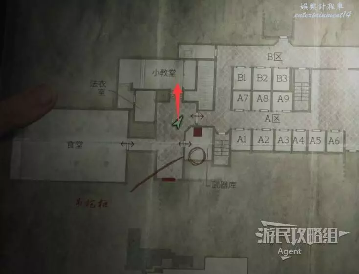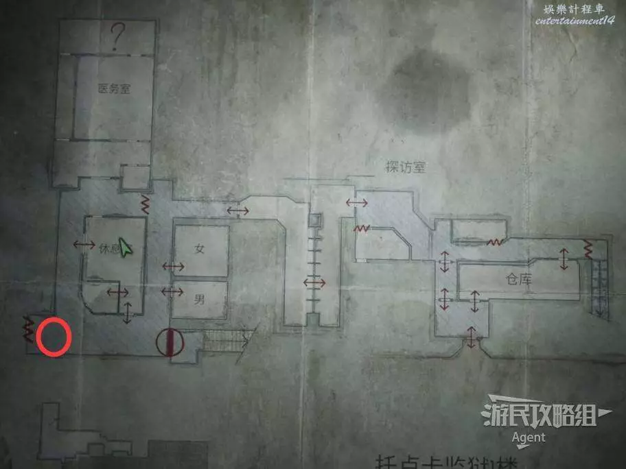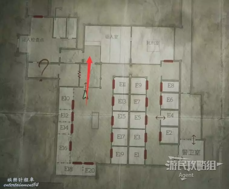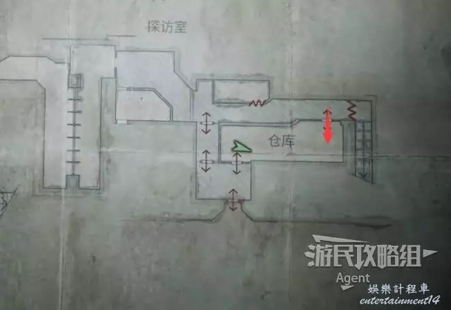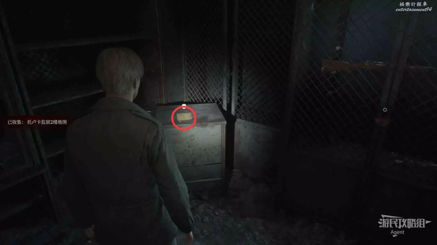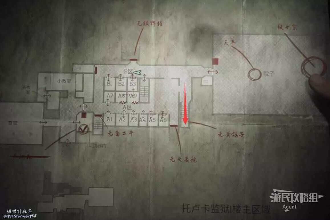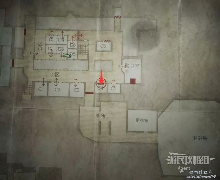 走出食堂後直接進面前的房間(武器庫)裡有存檔點和步槍子彈,牆上拿到【監獄地圖】。