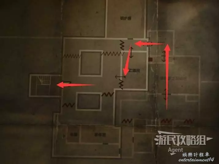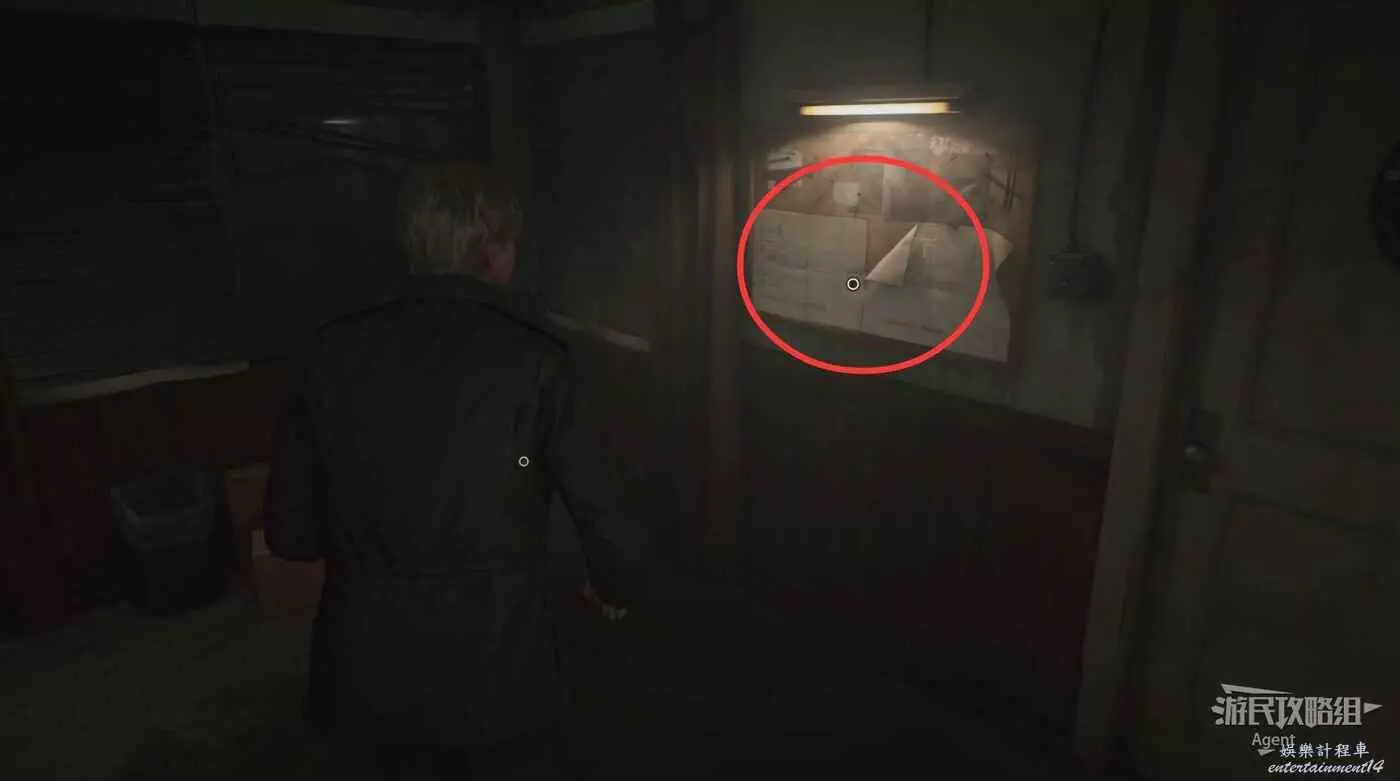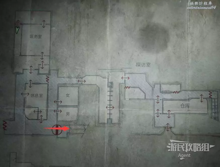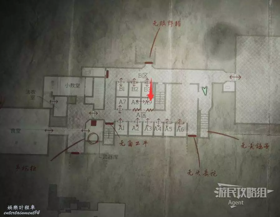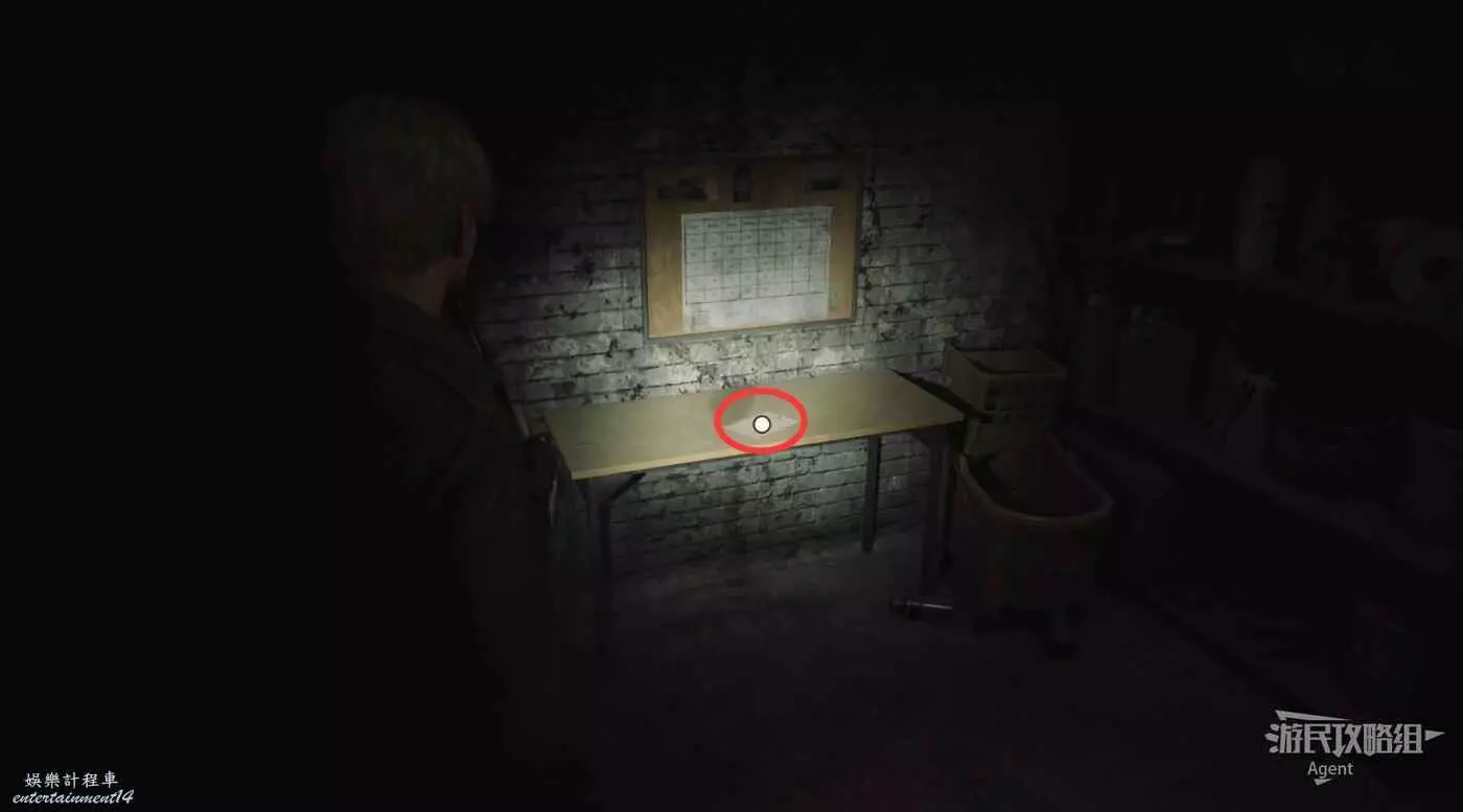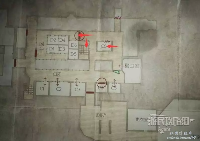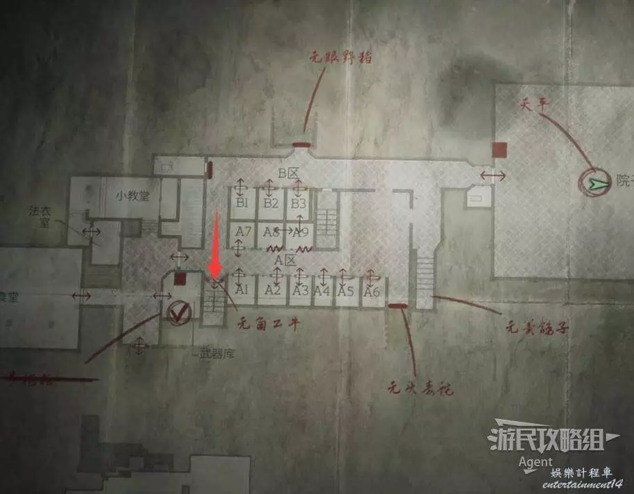 走出食堂後直接進面前的房間(武器庫)裡有存檔點和步槍子彈,牆上拿到【監獄地圖】。