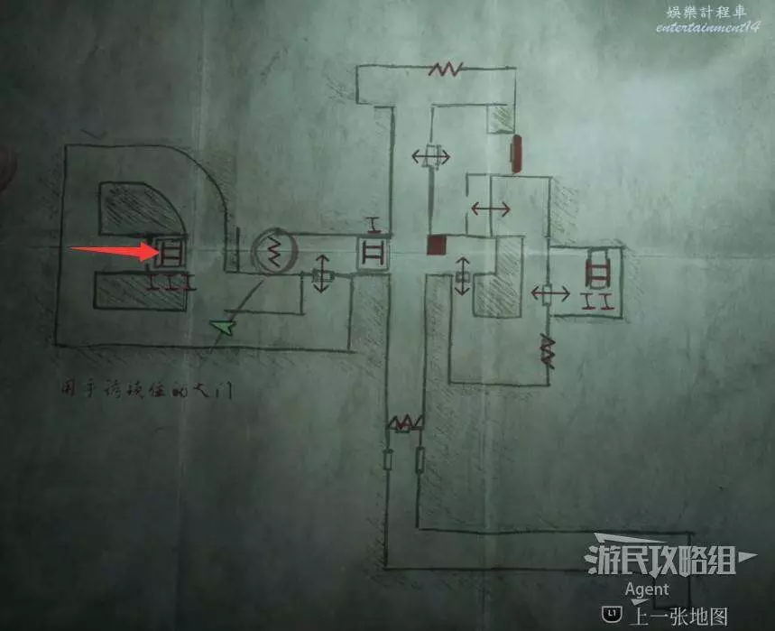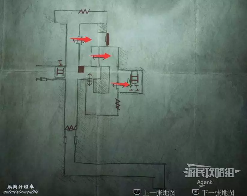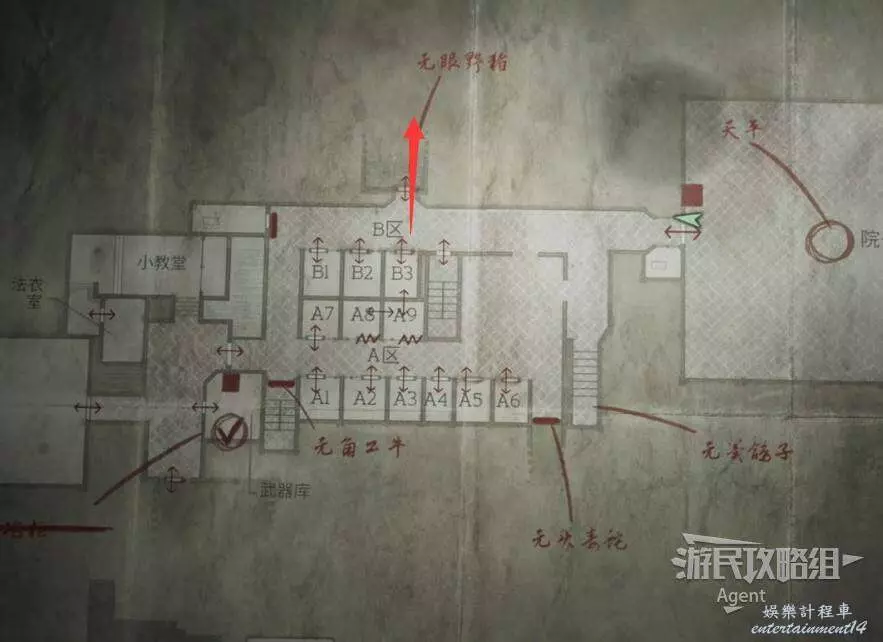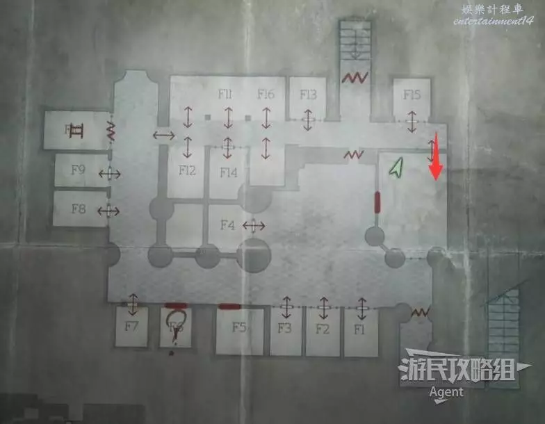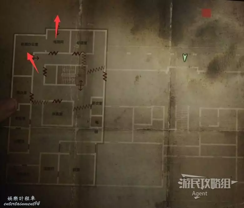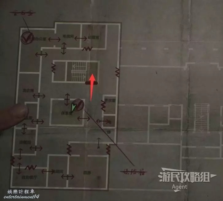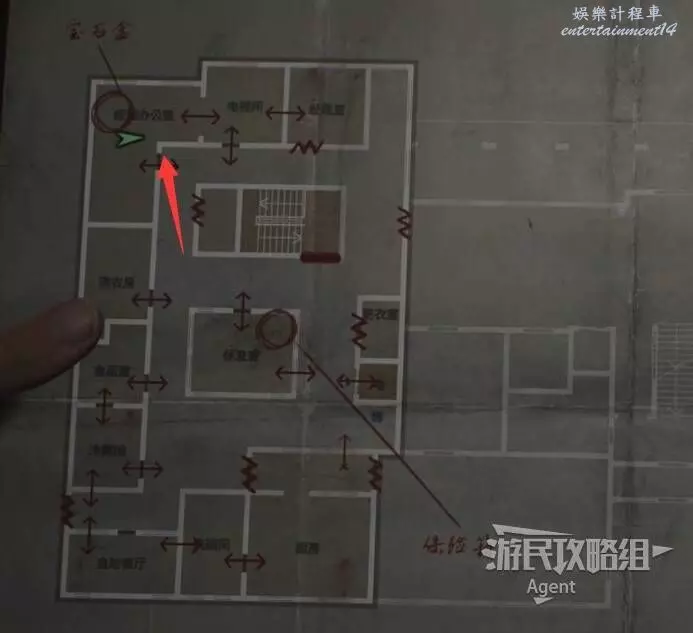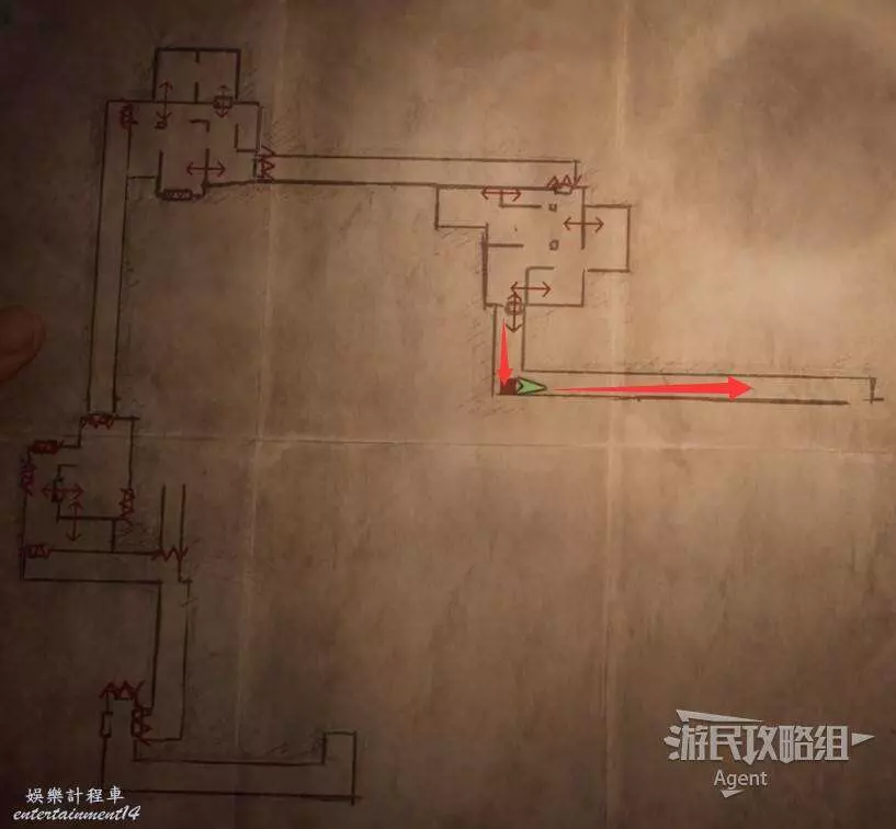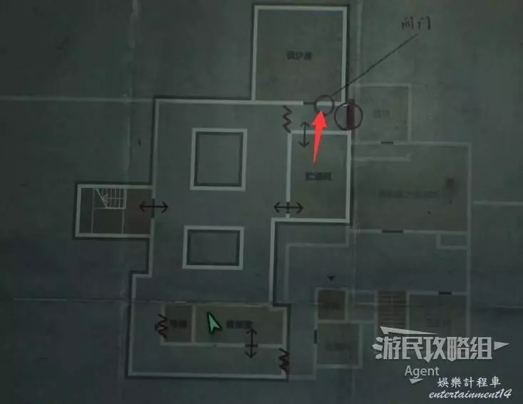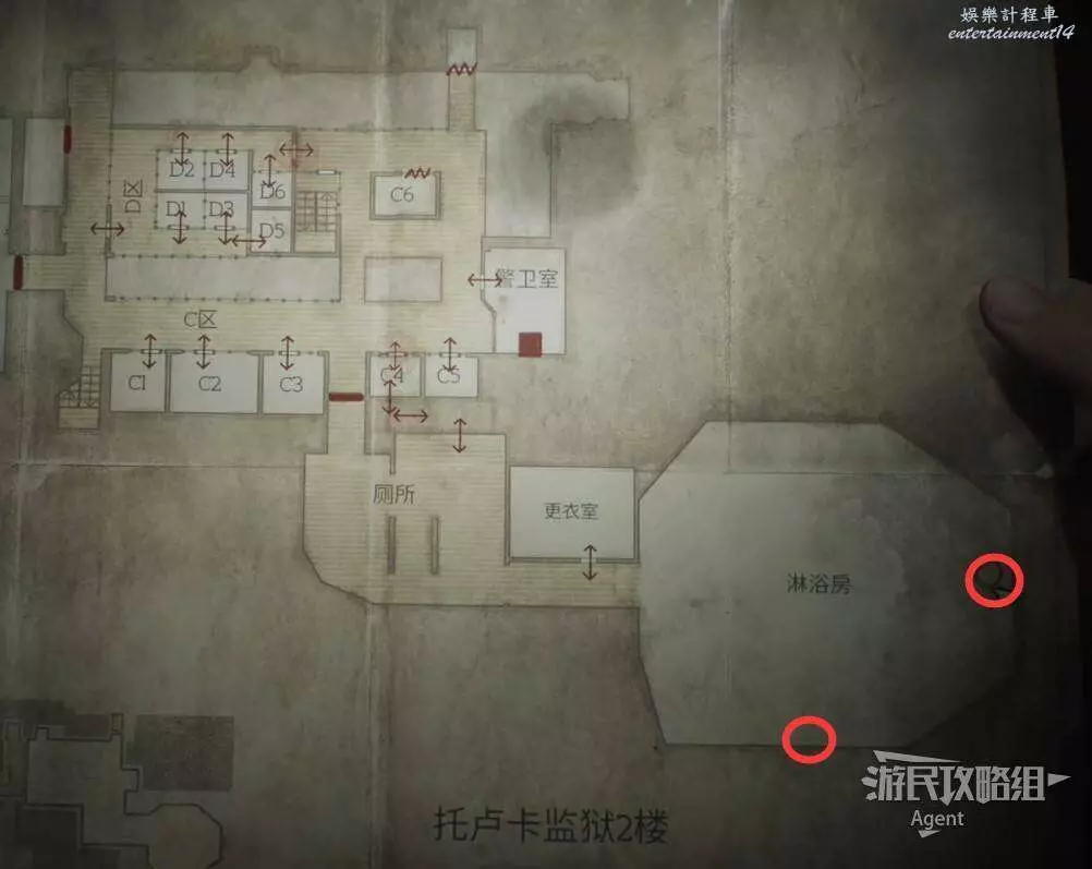 走出食堂後直接進面前的房間(武器庫)裡有存檔點和步槍子彈,牆上拿到【監獄地圖】。