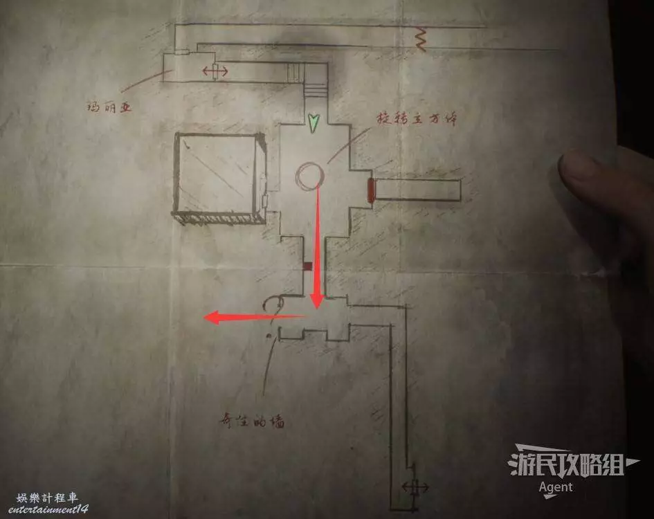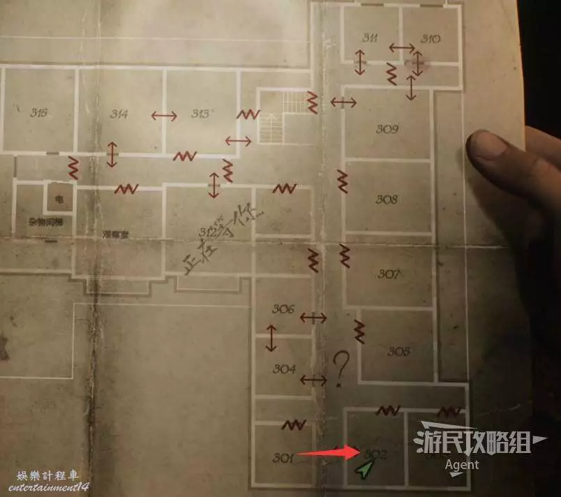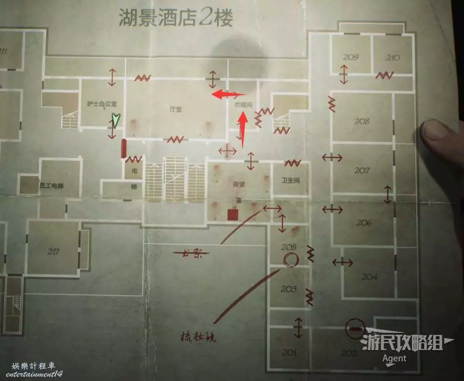 把302裡的推車拖出來,推到問號處,地板就會塌掉,跳下洞來到二樓。