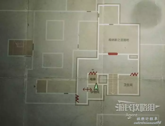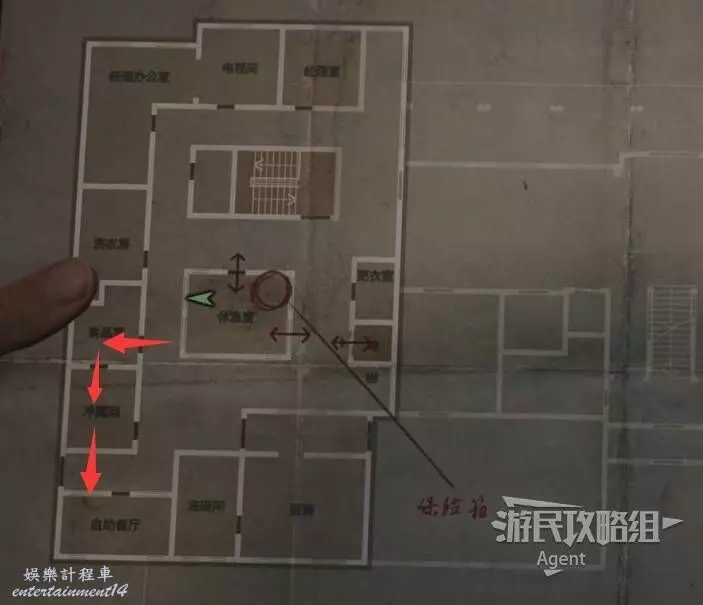 乘電梯來到一樓員工區,出電梯後直接進入面前的休息室,在牆上拿到【員工區地圖】。
