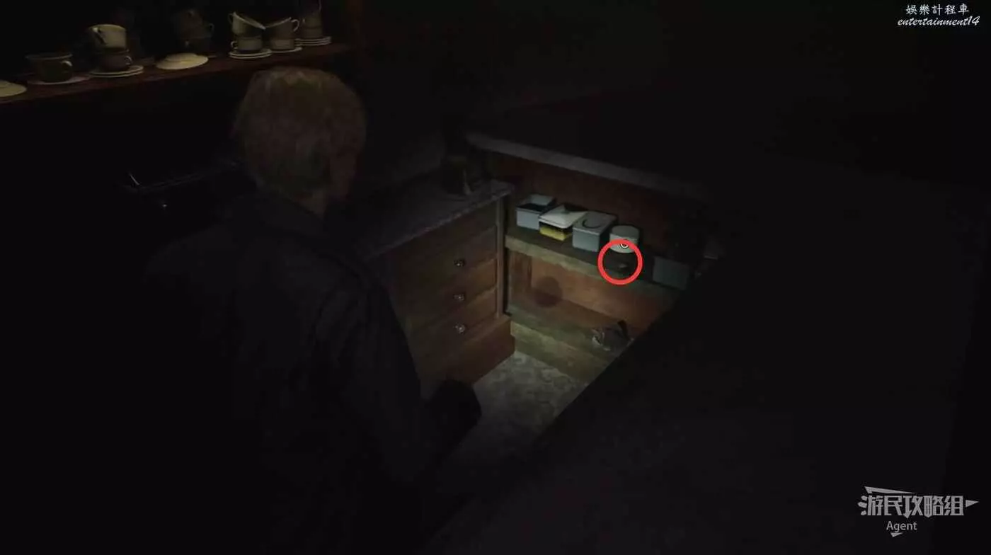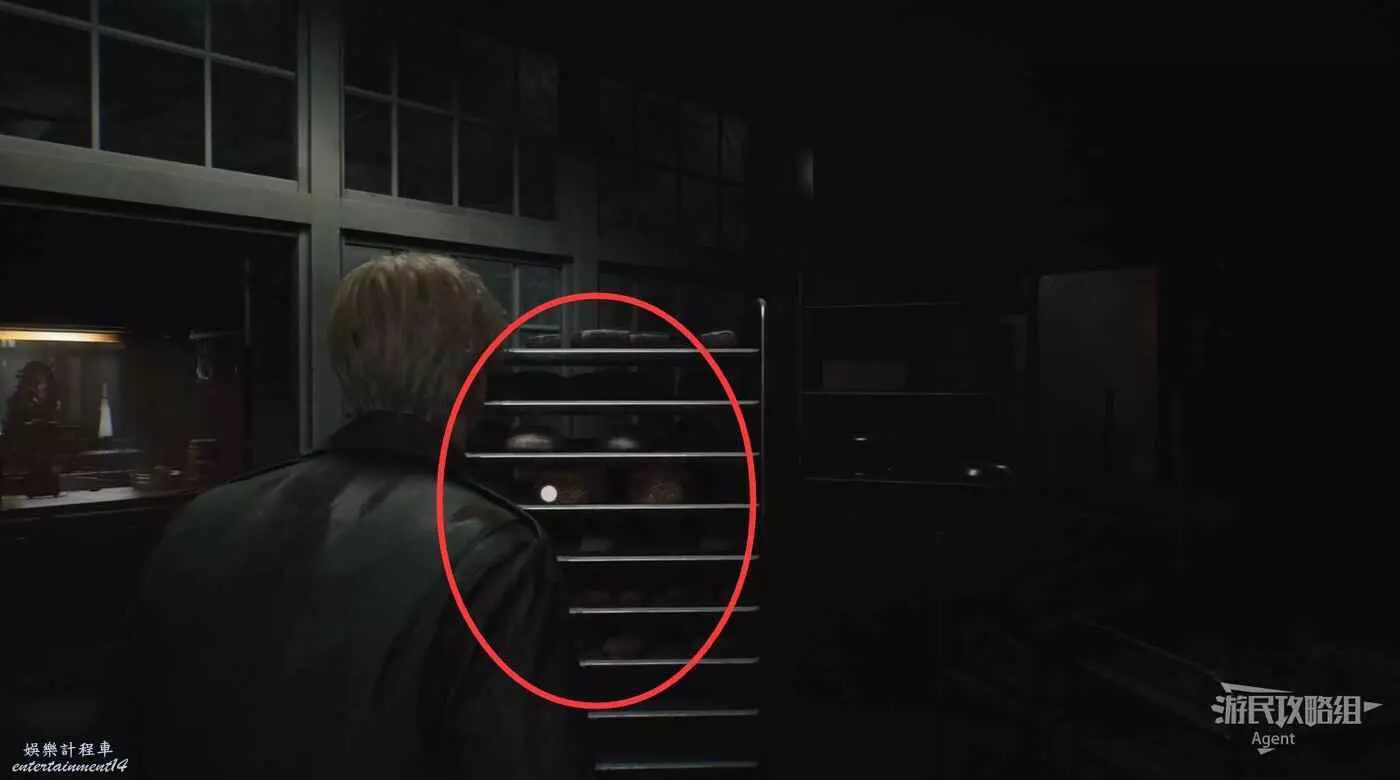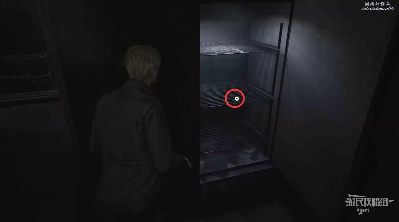 然後往東走,在下圖位置的房間裡,利用推車翻過牆到北面房間,在冰箱裡拿到【打火機氣體】。然後推開櫃子離開房間,返回十字路口。