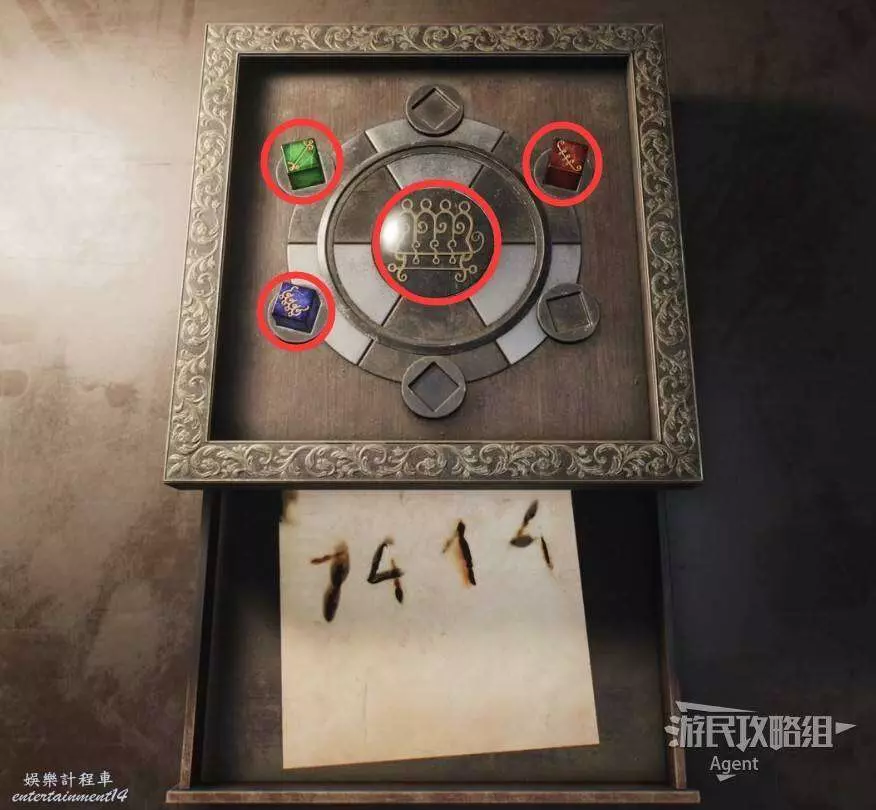如下圖擺上紅綠藍三個寶石,使中間形成完整圖案,得到【備忘錄】密碼鎖數位備忘錄。
