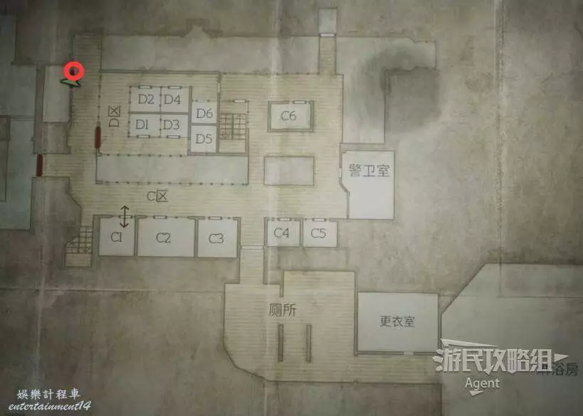 警衛室裡有存檔點,抽屜裡拿到【D區鑰匙】。