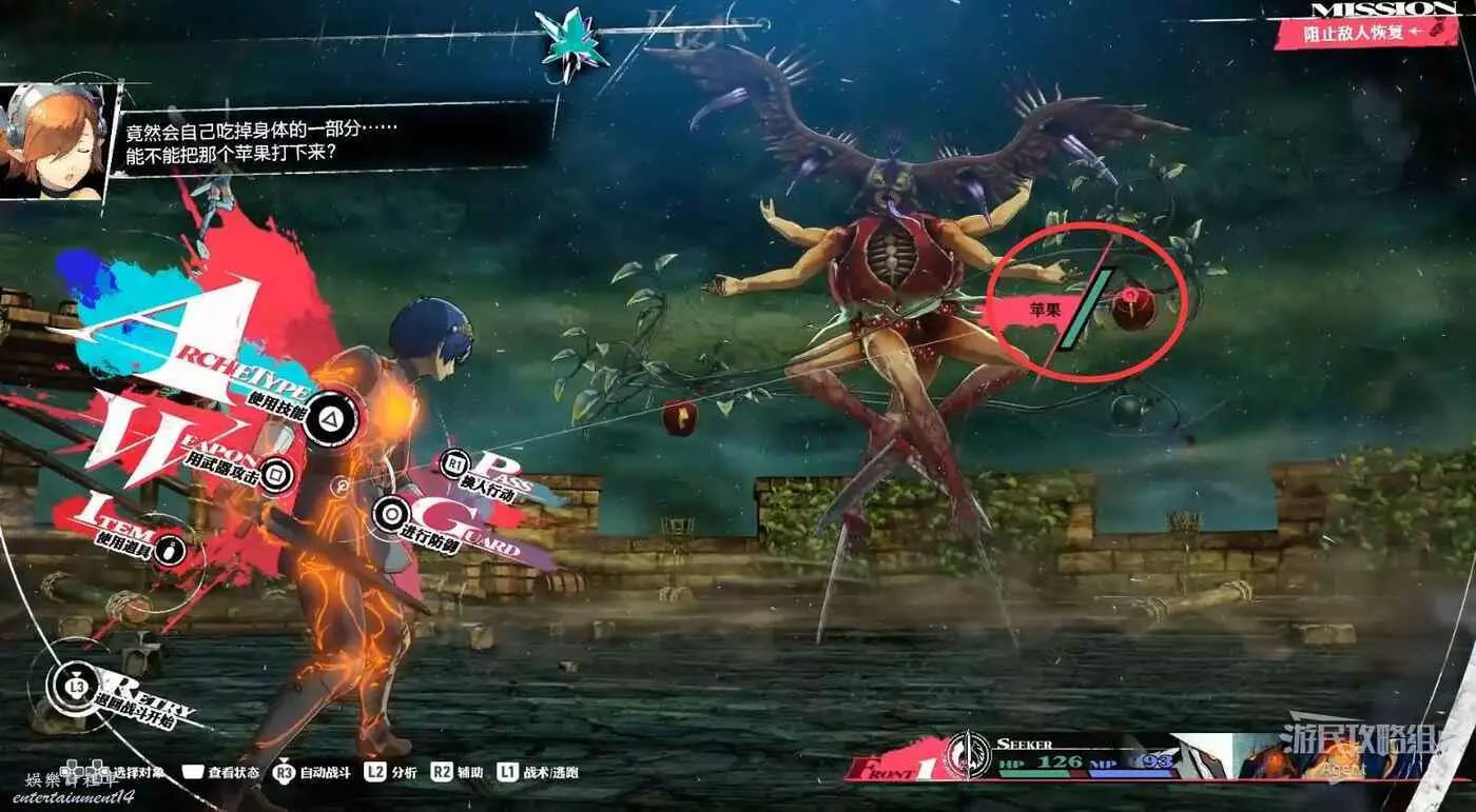 它會吃蘋果回血,要先把它身上的蘋果打掉。