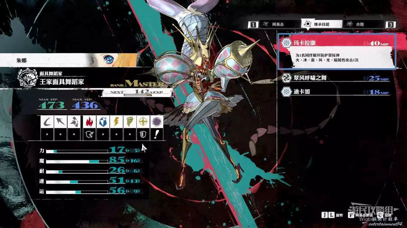 第二個角色選擇朱娜,使用【王家面具舞蹈家】,繼承技能【翠風呼嘯之舞】,每回合都給敵人上【風】屬性弱點,然後攜帶【救世主】面具隨時支援隊友血量。