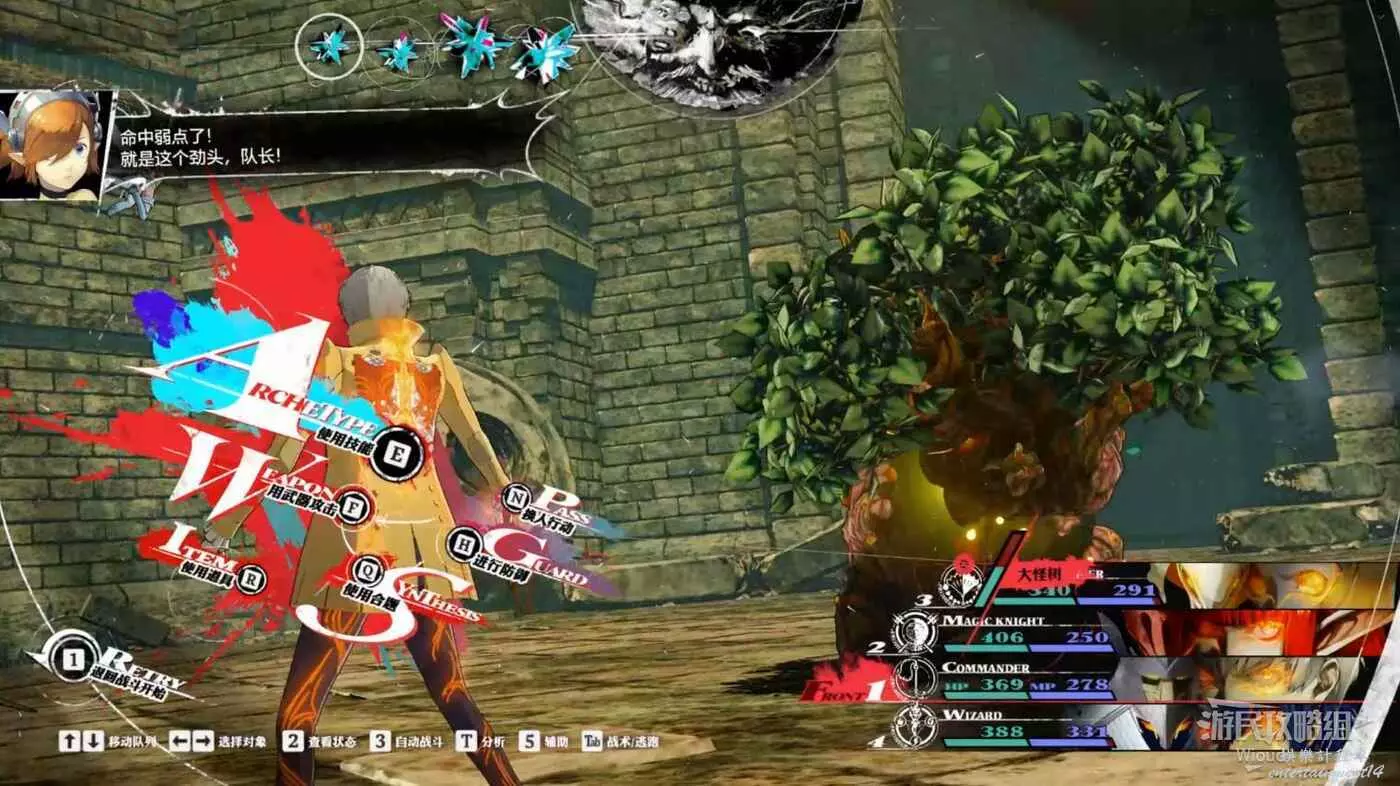 大怪樹不用看就知道弱火,直接用【火】屬性魔法抑制貫死就行,火屬性攻擊較多的隊伍就像打小怪一樣。