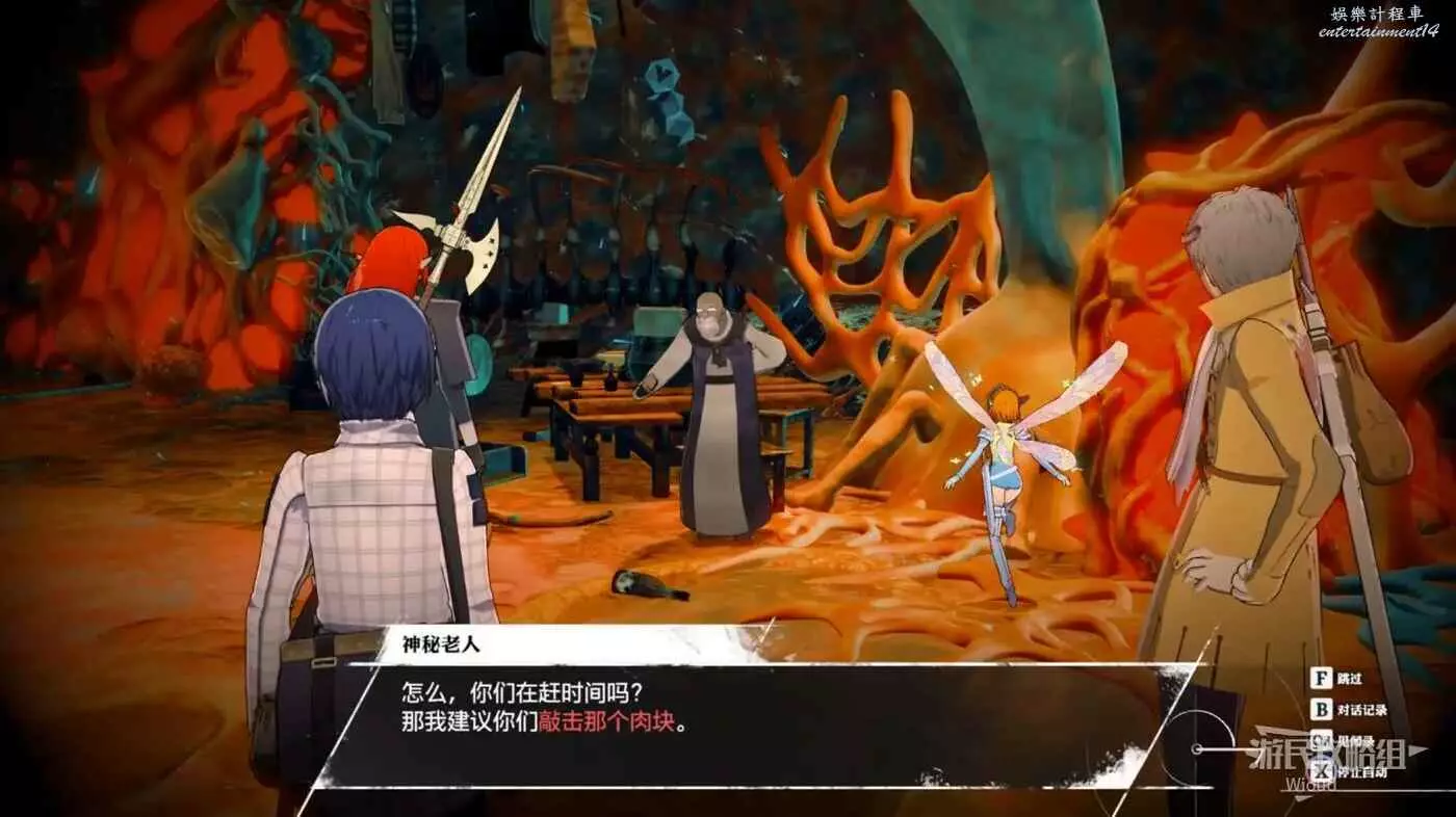 沒想到大沙蟲體內還有個老人在研究這個生物,他告訴我們只需要攻擊門旁邊的肉塊就能開門。