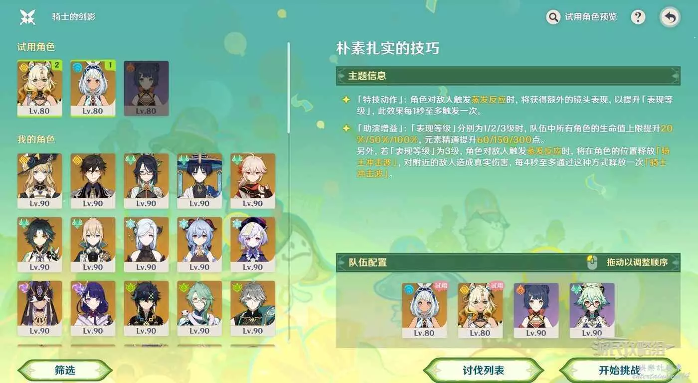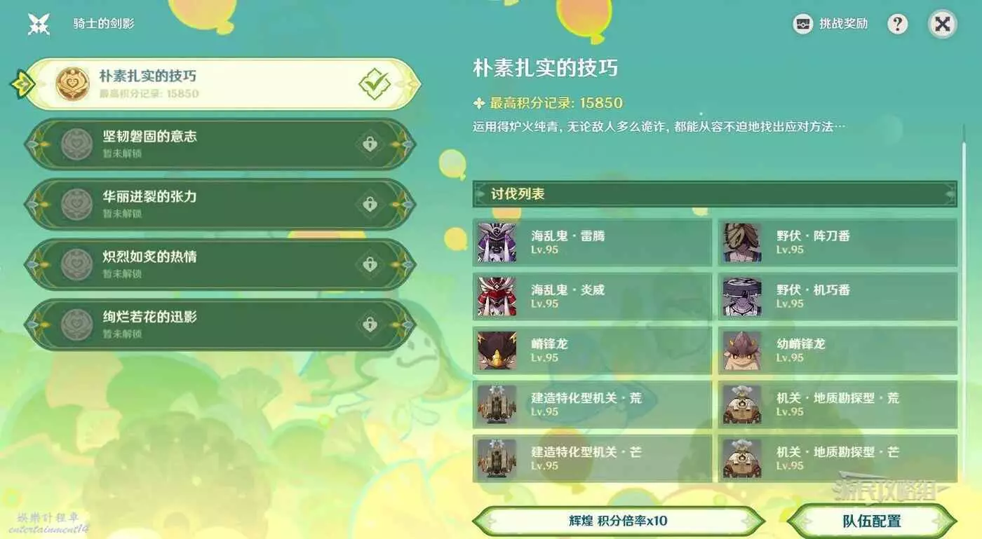 積分倍率選擇10,本關的增益需要儘量多地觸發蒸發反應,建議隊伍中攜帶後台高頻掛水或火元素的角色。