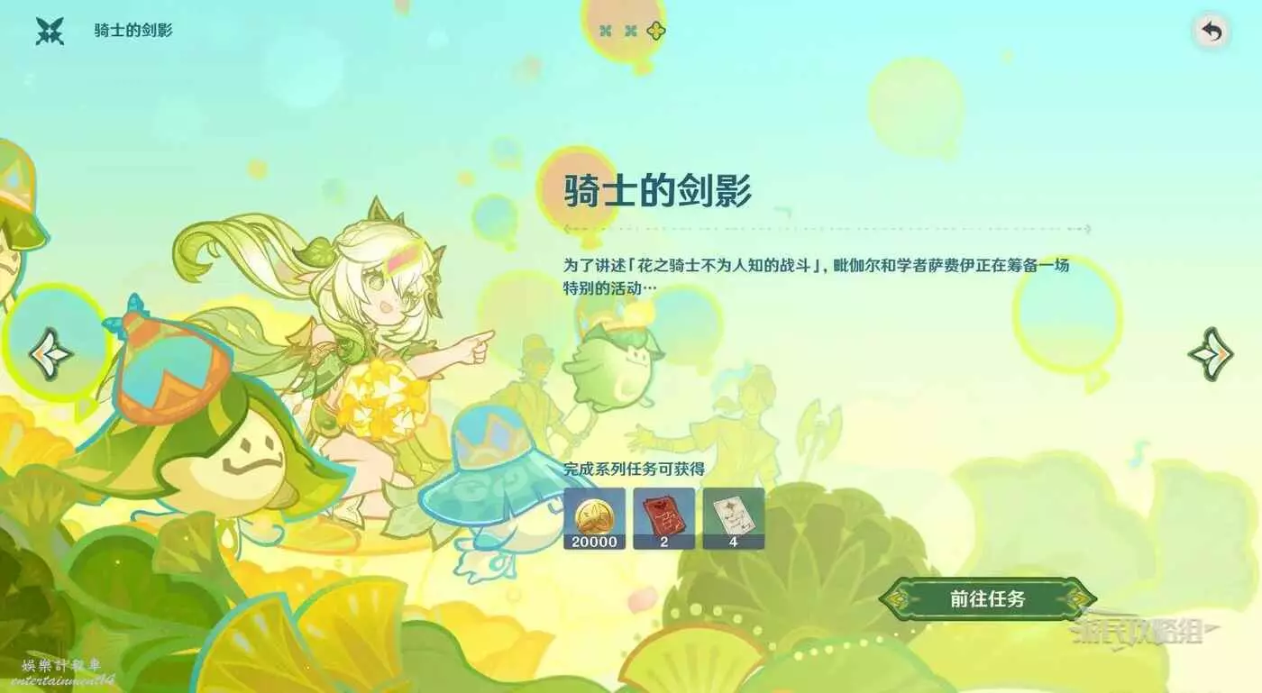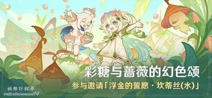 - 活動獎勵:坎蒂絲邀請函、塵歌壺花車擺設、原石、智識之冕、天賦培養材料、武器突破材料、角色培養材料、聖遺物經驗材料、大英雄的經驗、精鍛用魔礦、摩拉