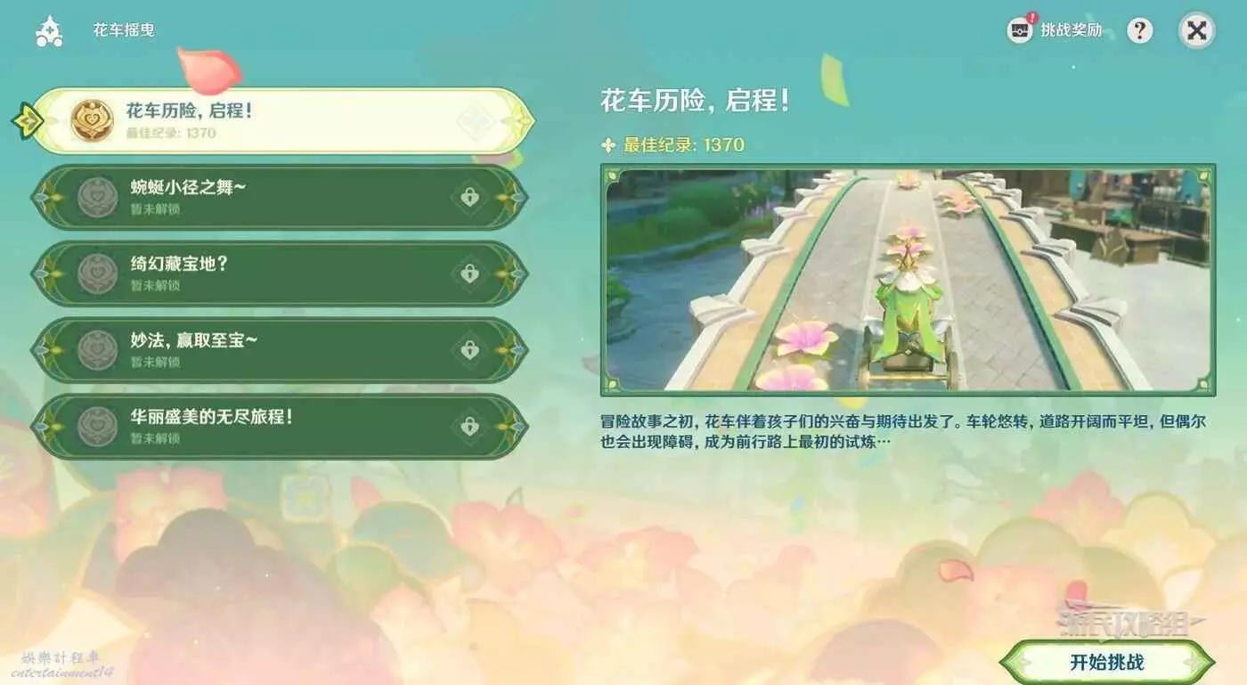 - 活動說明:活動期間,將陸續解鎖「花車搖曳」、「交映現實與夢」、「騎士的劍影」各階段玩法。「花車搖曳」中,旅行者需要操縱花車躲避障礙,在前往終點的途中盡可能收集花朵,獲得更高的得分。「交映現實與夢」中,旅行者需要根據描述,説明夢境主人尋找異常之處,調節病人的各種心理障礙。「騎士的劍影」中,旅行者需要以特定的方式進行戰鬥挑戰,擊敗敵人,重現花之騎士的英姿。完成挑戰後,可獲得「慶典熱度」。累計獲取指定數量的「慶典熱度」即可邀請「浮金的誓願·坎蒂絲(水)」,還可獲得原石、智識之冕等獎勵